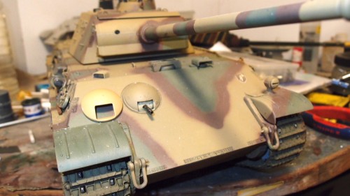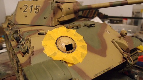 When you hit a brick wall on a build what next. Go and fix something that annoys you, this time its the HL armoured mg ball cover. As on the Taigen Panther its the wrong shape ,far too rounded and the cutout is at wrong angle and smaller. Tamiya to the rescue an easy fix , only one colour to patch.