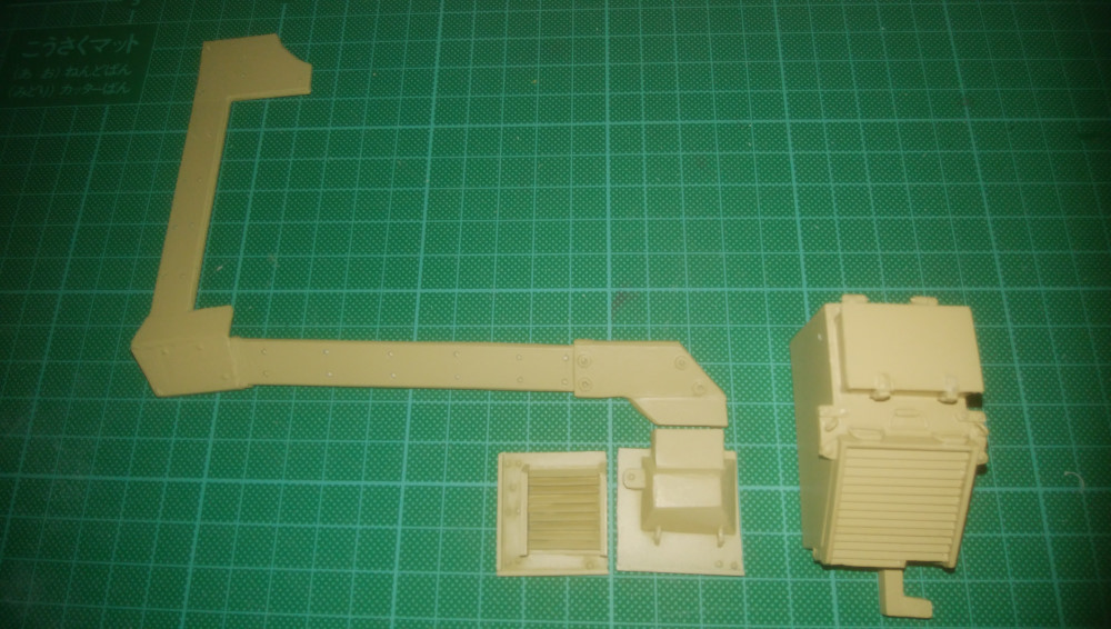 Next is the exhaust deflector installed in the exhaust port of the tank. Since the exhaust of the gas turbine engine is hot, it is installed to prevent burns. It ’s not necessary for diesel engines like other tanks. I made ?his with a plastic board. Inside the deflector there are things like mounting reinforcements or rectifying plates.