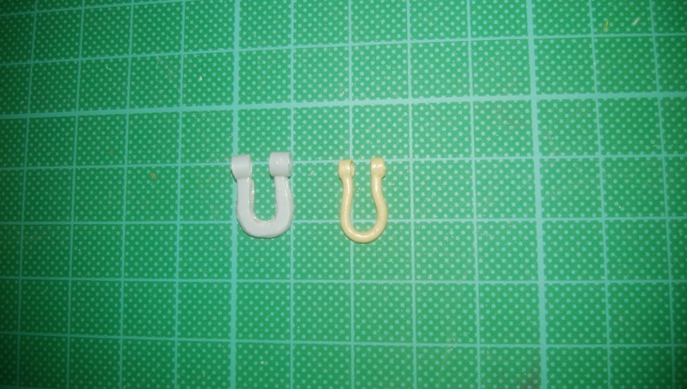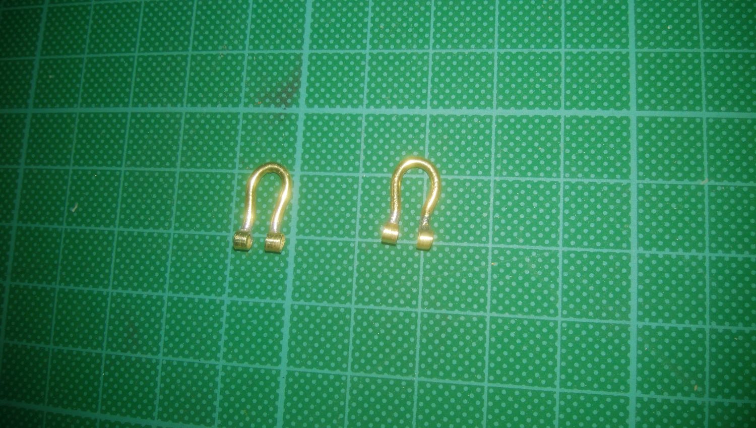 However, this method is very troublesome and time-consuming for me. After all, I abandoned this method halfway and decided to bend the 1.5mm? brass rod into the shackle shape and cut and solder the brass outer diameter 2.3mm pipe. This is easier to manufacture and the shape of the rounded part is also beautiful. The right is made of brass (painted), and the left is a plastic shackle. The plastic has not been rounded yet.