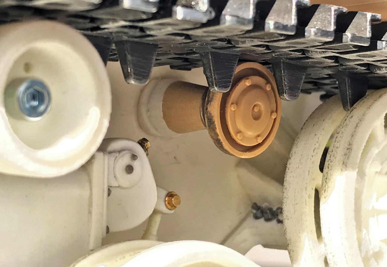 View of the roller installed just behind the idler at the front in a different arrangement than at the rear. It is also a Tamiya Panzer IV ausf J single roller wheel but with also the mount, adapted for the Centurion hull. The look is close to the real one.