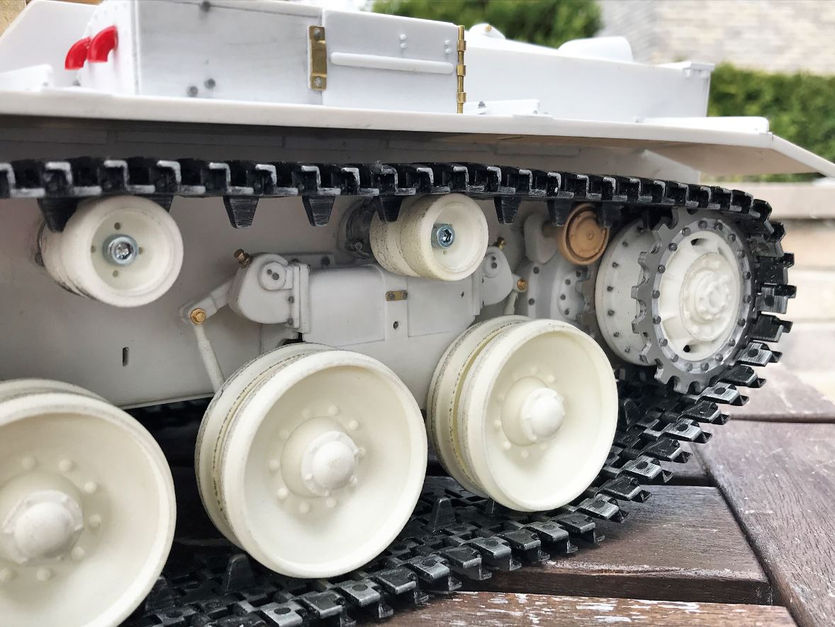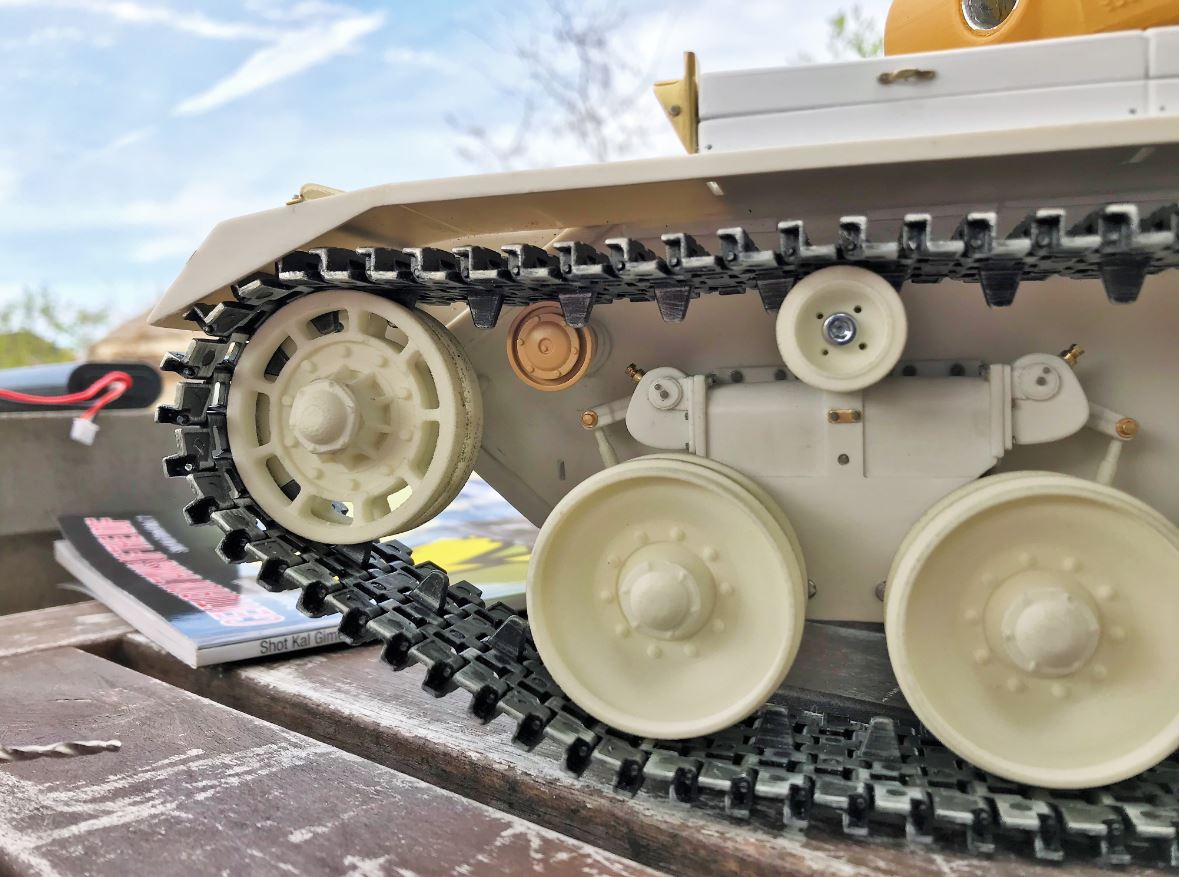 The tracks were installed. For sure, anyone that has build a Ludwig Centurion knows that the arms on the suspension spring inside the boggies disengage every time you lift the tank. This is not a zero gravity suspension... These arms need to be annoyingly realigned inside the central spring before depositing the model again on its roadwheel. My hope was that the tracks will keep the suspension sticking together when I manipulate the model. It helped a bit but did not solve the issue completely.