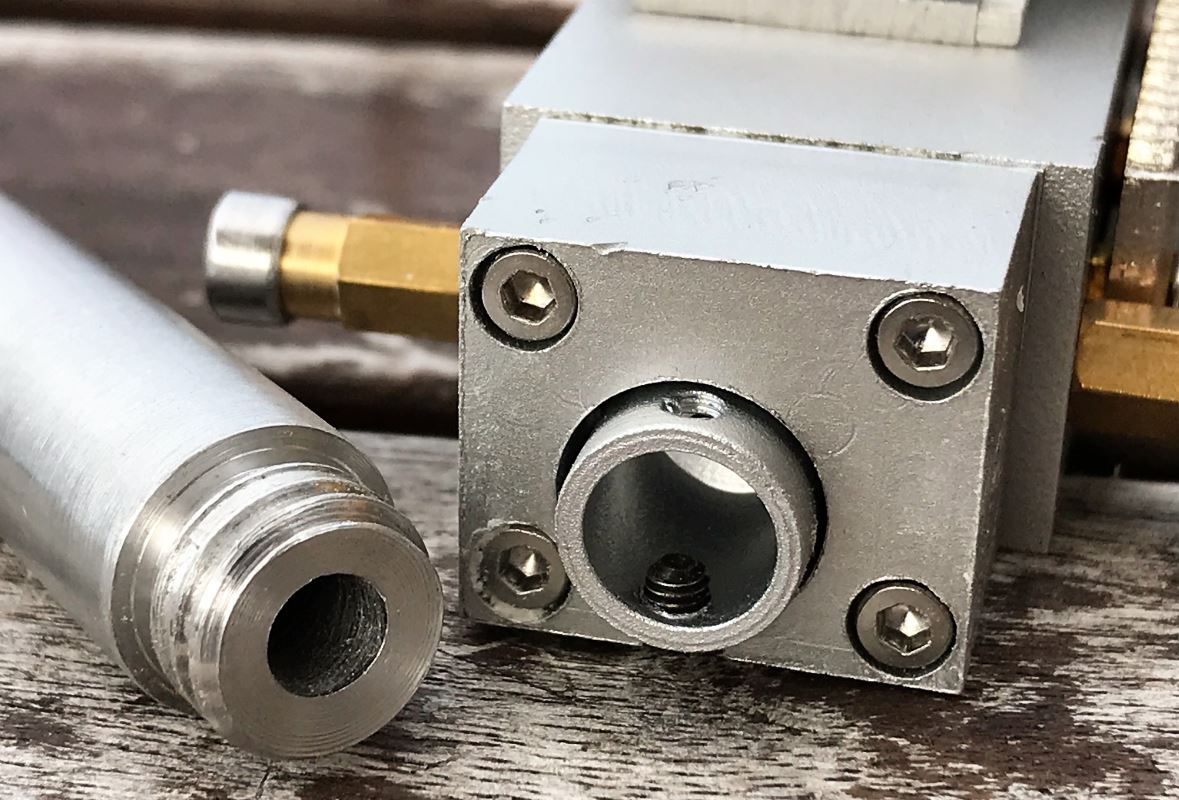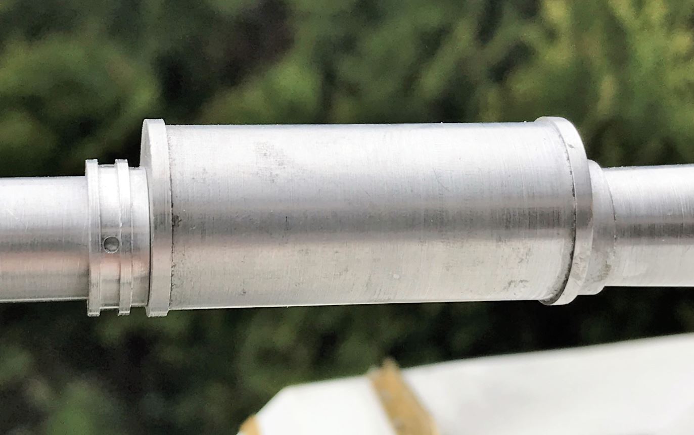 View of the gun barrel extension ready for installation on the recoil unit.