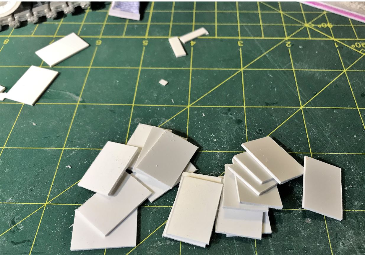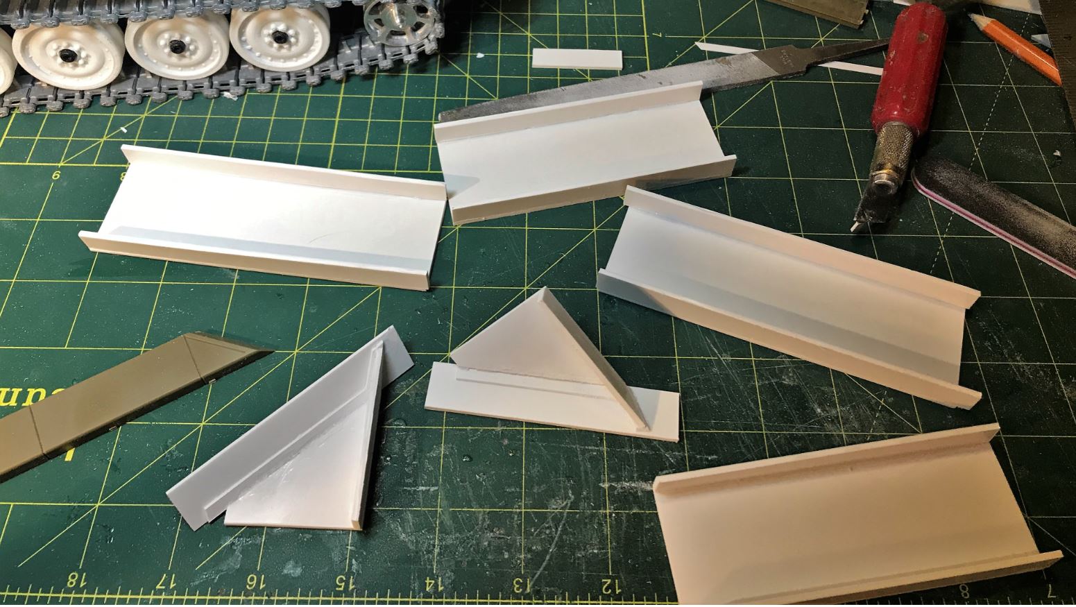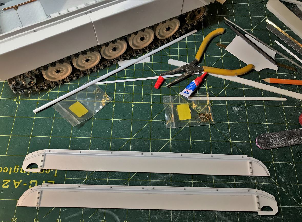 Like any M113, the MRV is optionally equipped with its side skirts when on the field. They have different mounting arrangements, some have full size skirts, some shortened with cut mud guards, some not at all. The easy way out would be to skip building them but it is not my style.