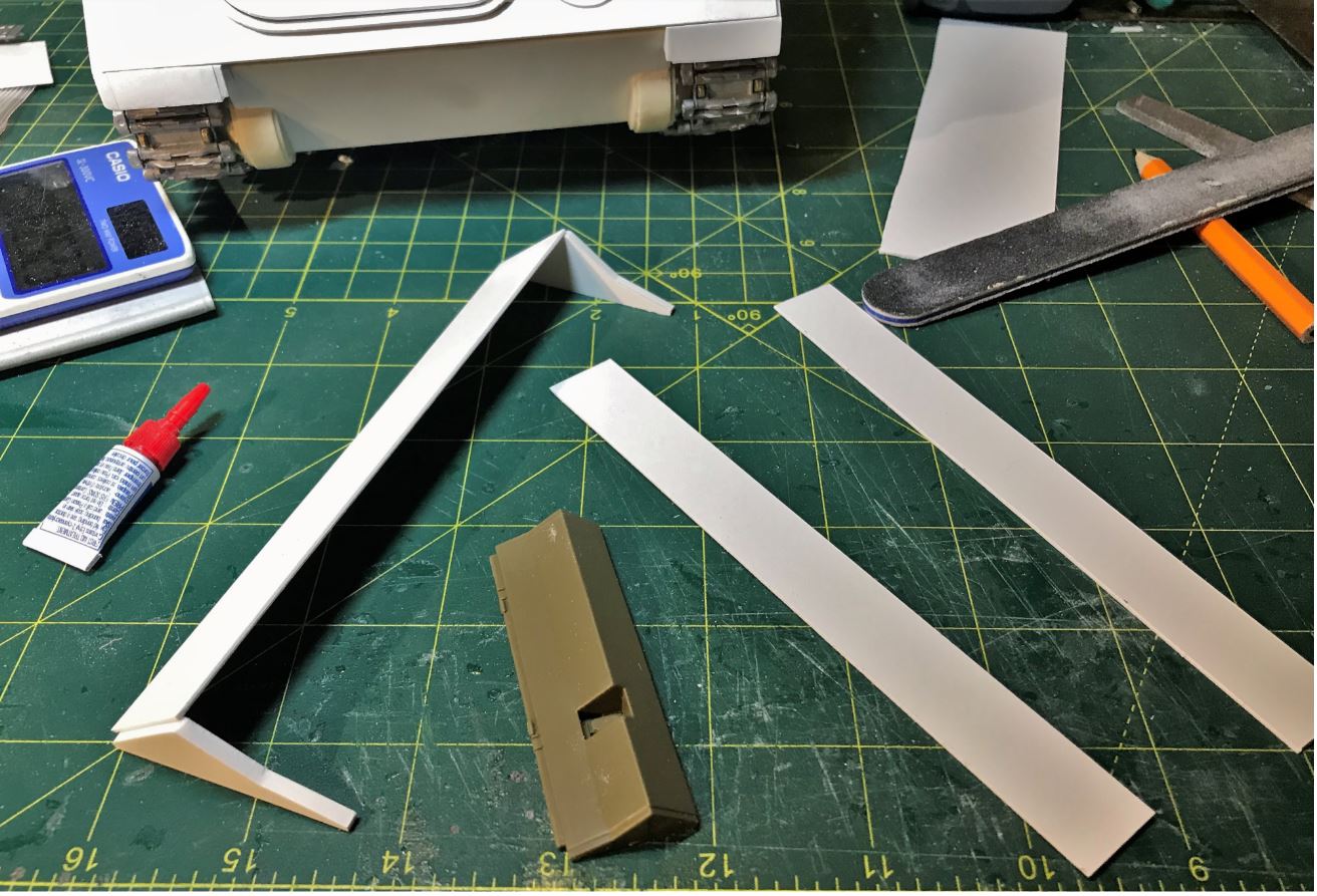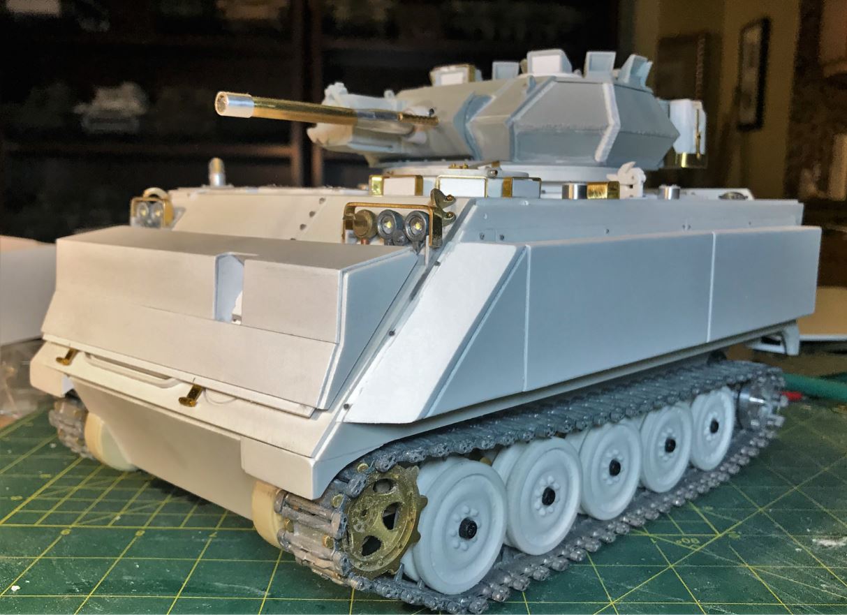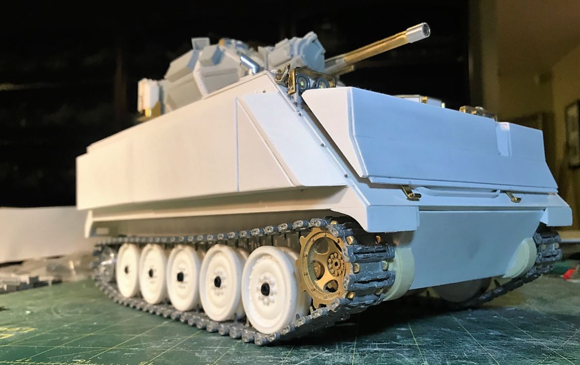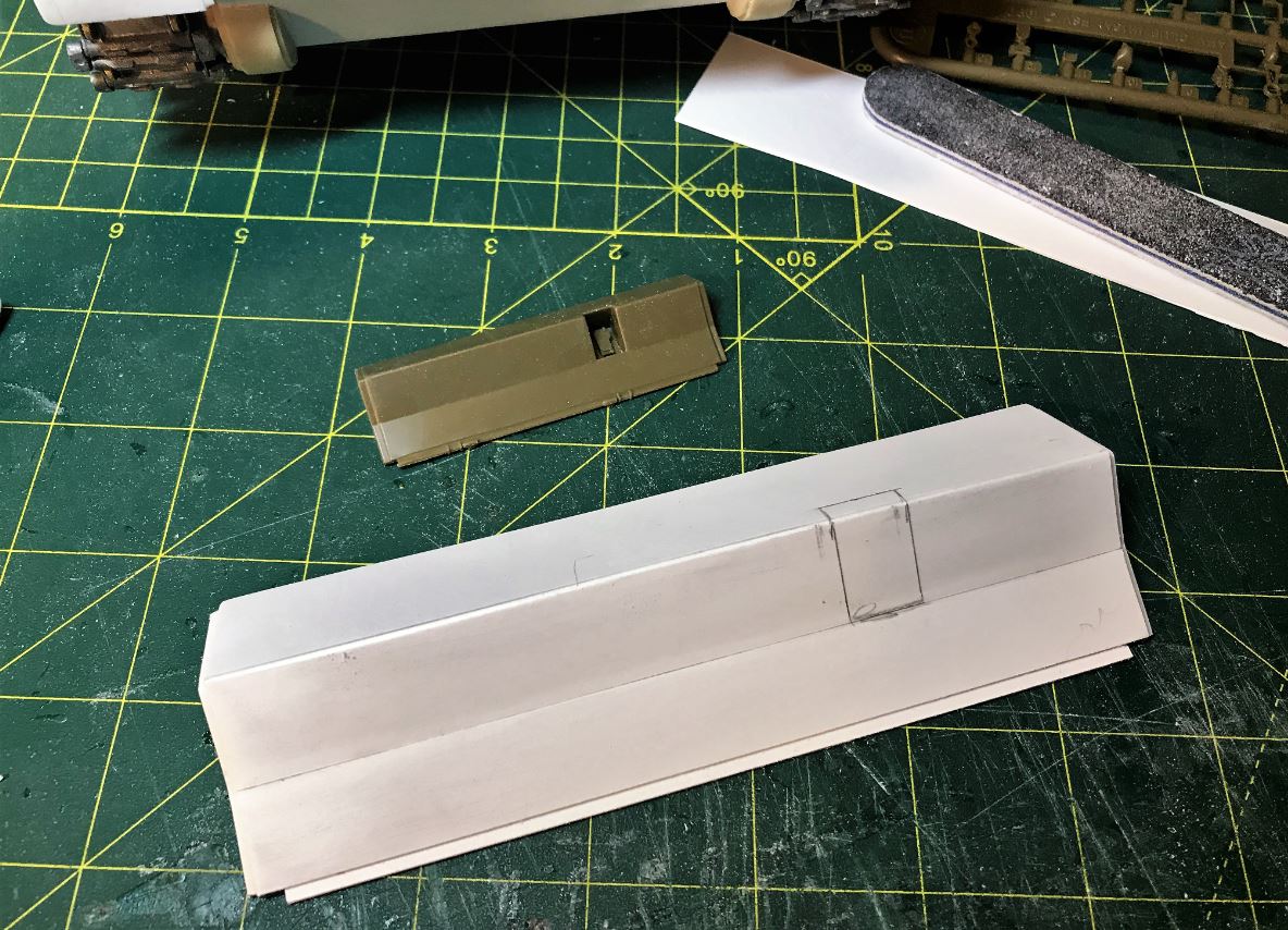 Like any M113, the MRV is optionally equipped with its side skirts when on the field. They have different mounting arrangements, some have full size skirts, some shortened with cut mud guards, some not at all. The easy way out would be to skip building them but it is not my style.