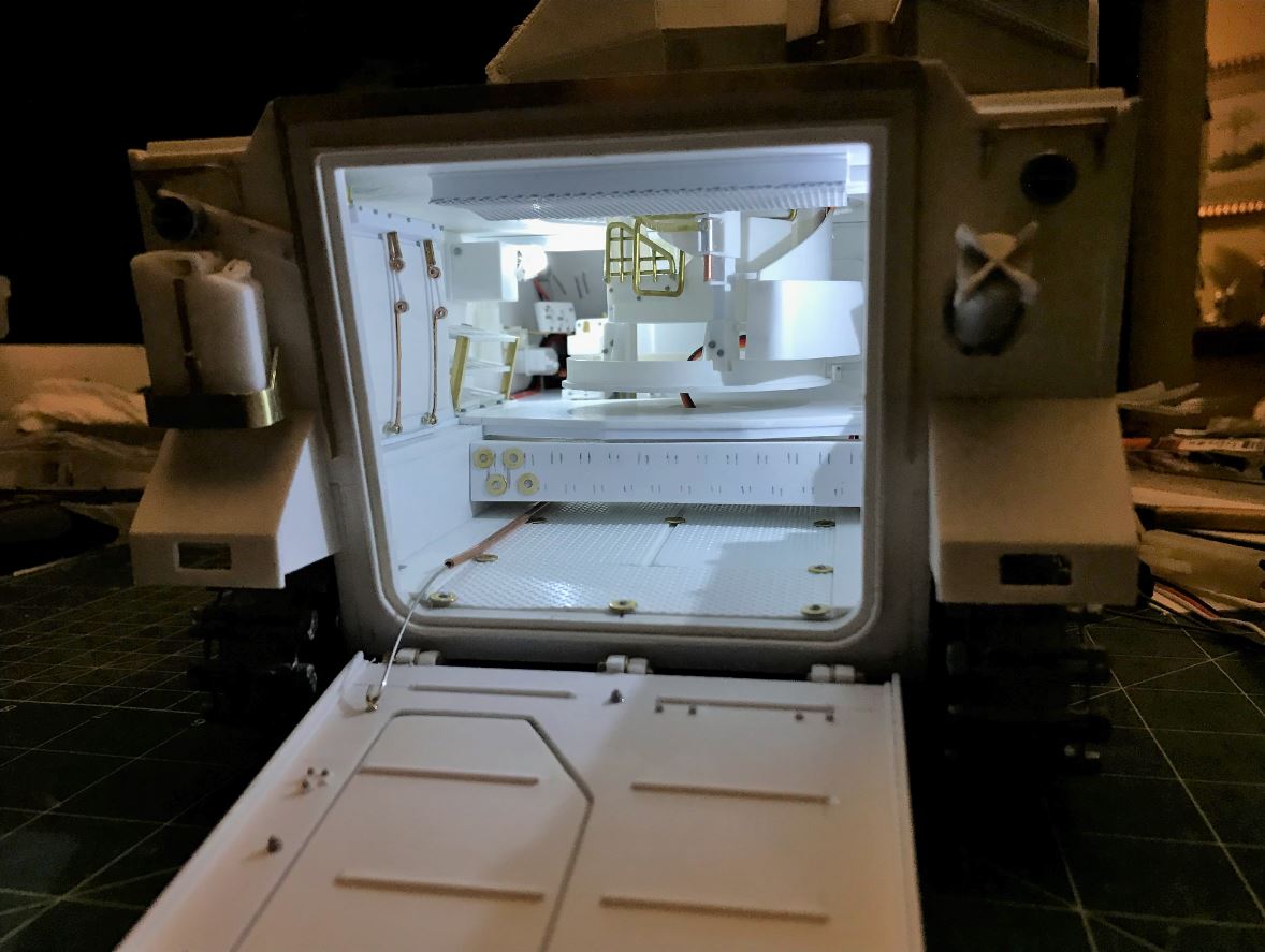 The MRV has a different drive hatch than regular M-113. It has a complicated mechanism that is a challenge to reproduce. Because of the turret above, it needs to open horizontally after being raised a few inches. I wanted a opening hatch so i had to compromise on a couple of areas to make this work in scratch.