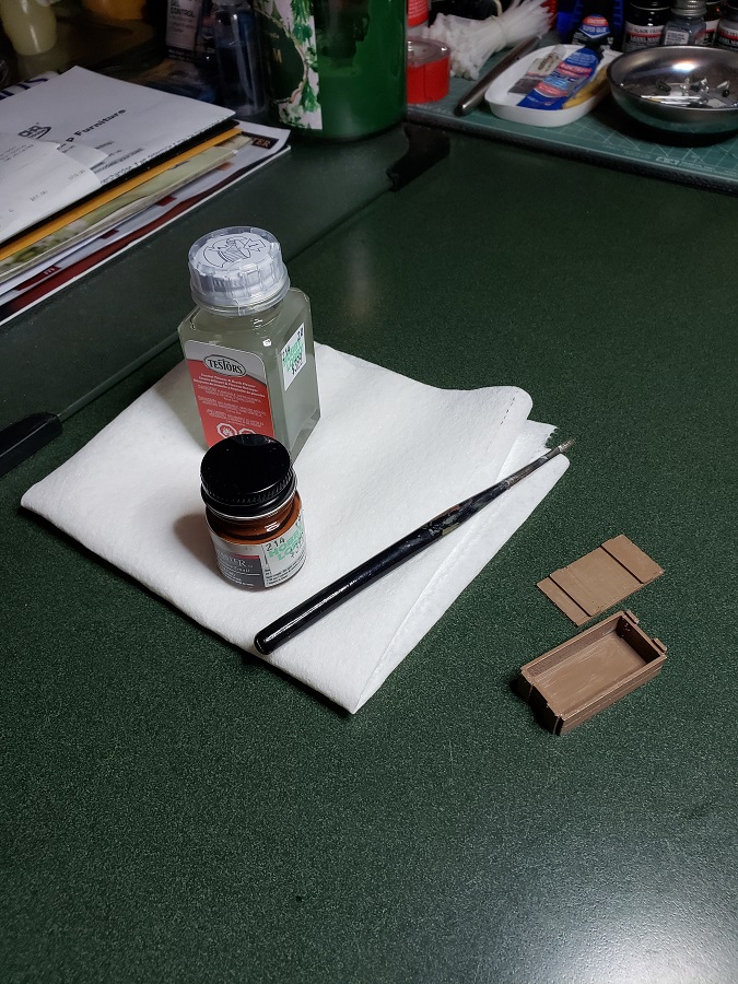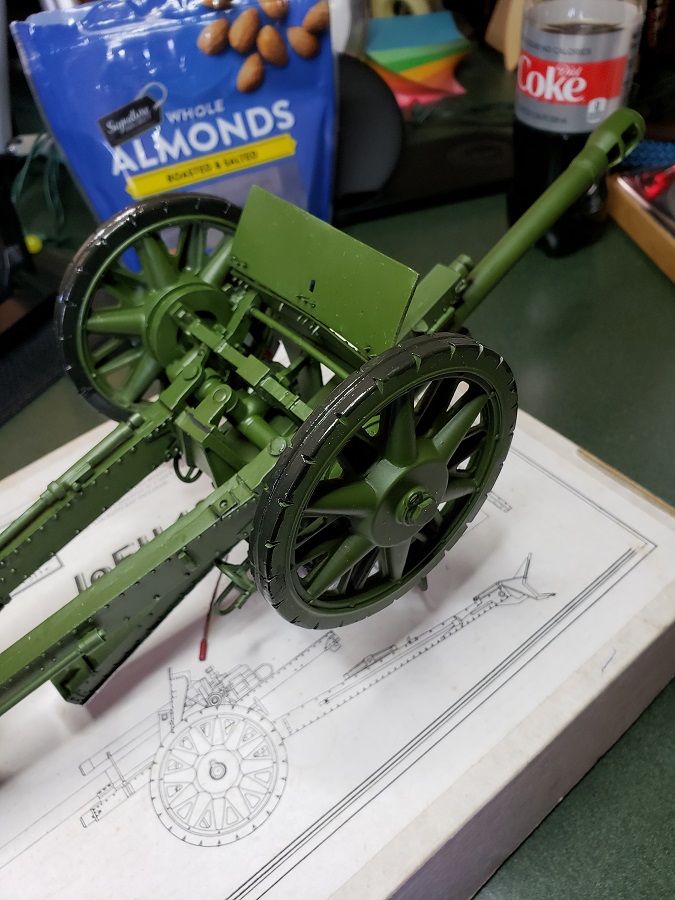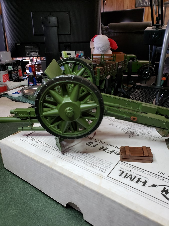 I had time this morning to get out my black rubber paint and take care of the wheels on the field piece. It is a gummy job and requires thinners for small applications ( like scale models ) Works well when applied and will help cushion the wheels when the gun is being towed. Pics: ( Click to Enlarge )