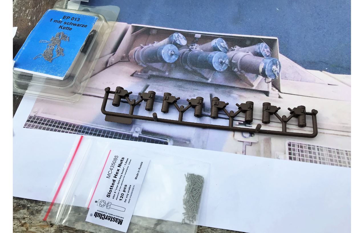Heng Long Leopard 2A6 smoke grenade dischargers coming with the accessory set were bought from Toucanhobby on eBay, its pretty much the only affordable game in town for these. The 2A6 set also comes with mirrors and other items that are useful.