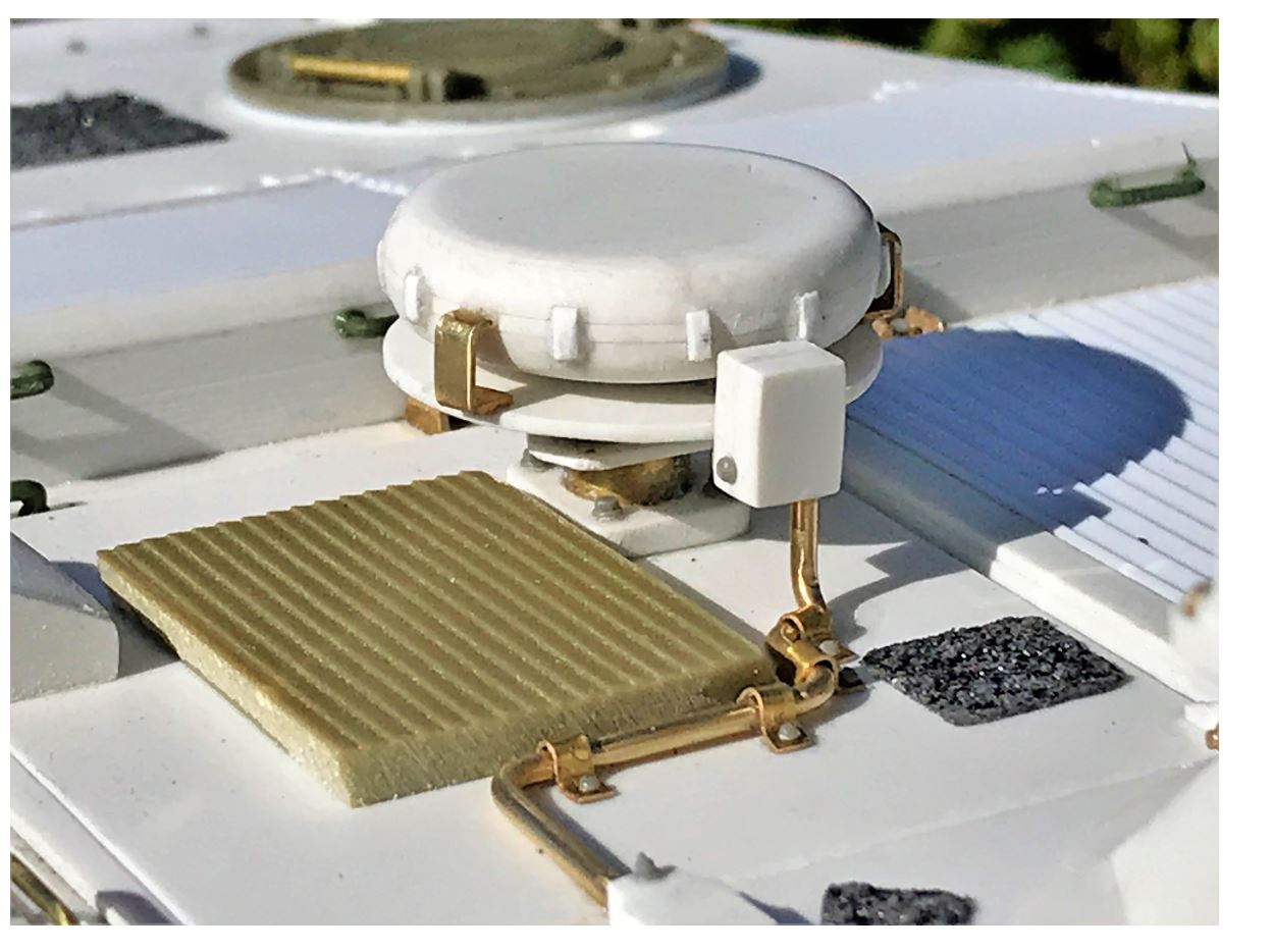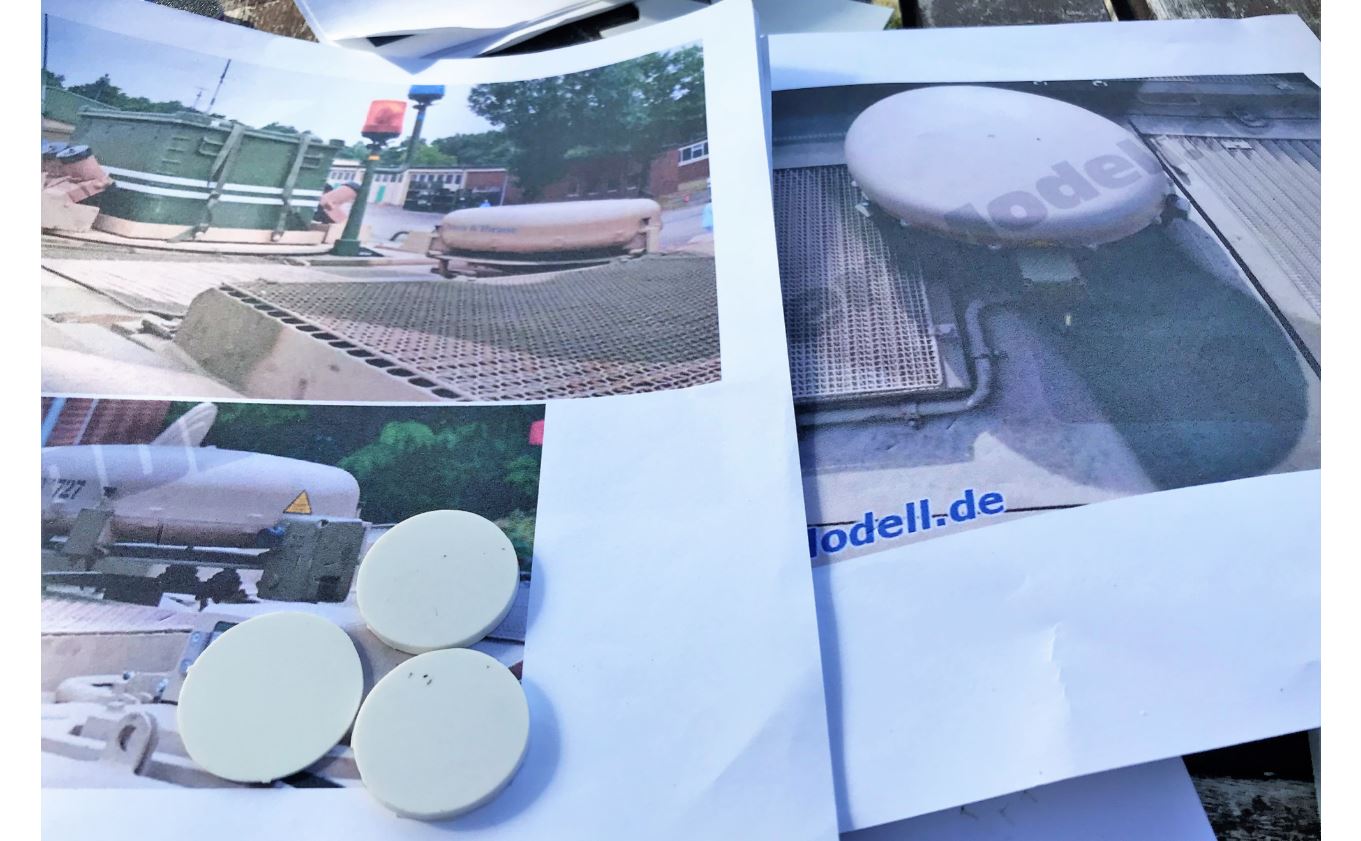 Many Tpz-1 are equipped with a Satcom antenna behind the engine grills at the front. This antenna looks too cool not to repro for my model.