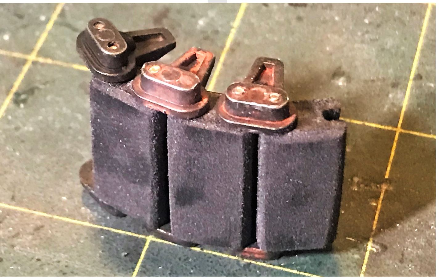 The rubber pads are superglued to their plastic host, sanded on all side and surfaces for an integrated and worn out look.