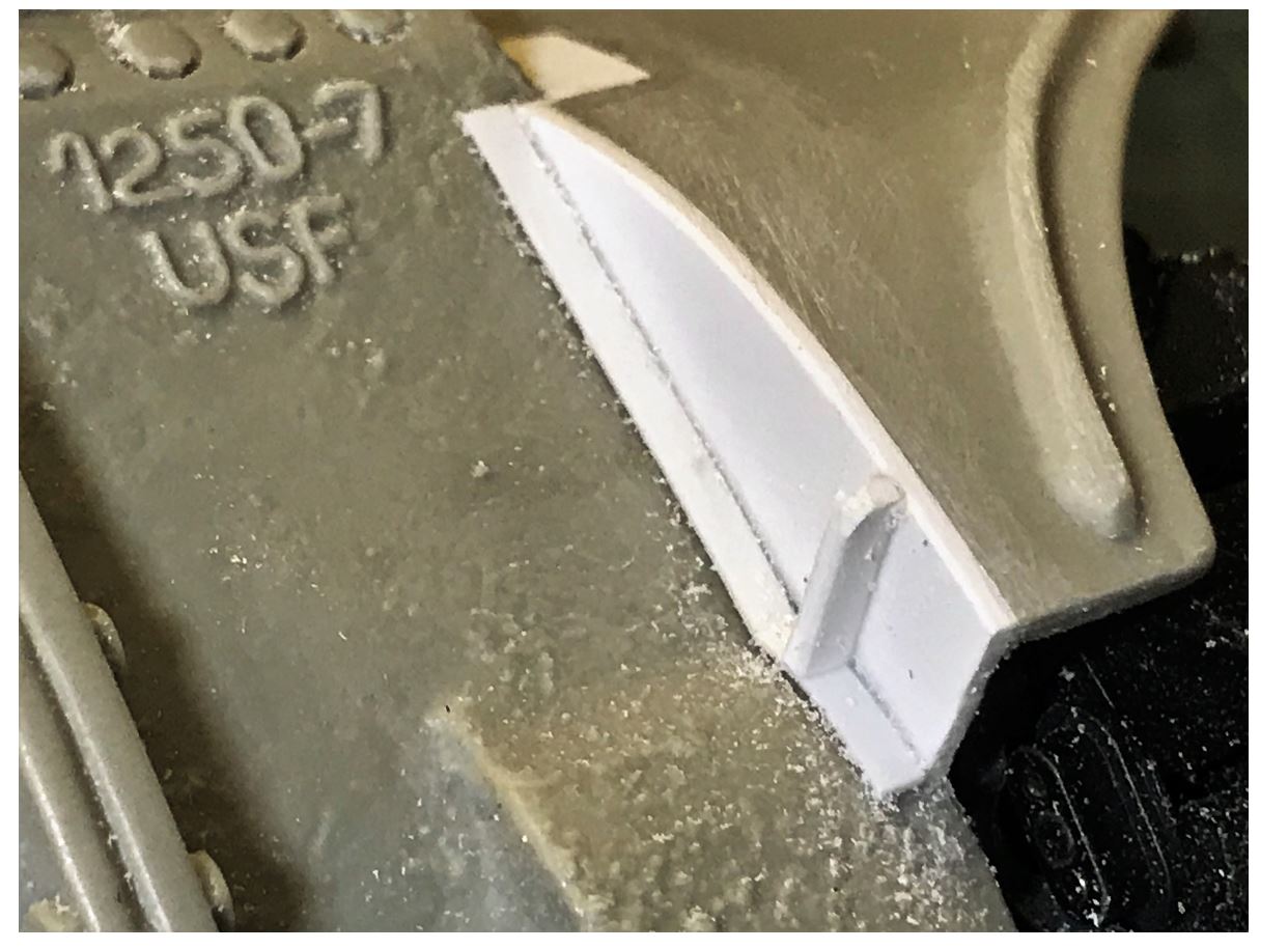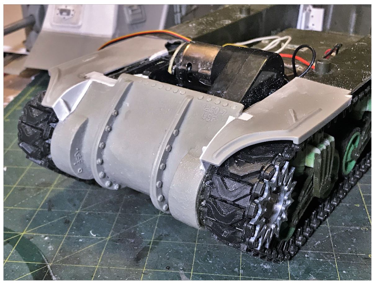 After the fenders are glued in place, the builder is left with quite a few issues and holes to fill with polystyrene strips. The way the removable upper hull sits on the lower hull need attention and fine tuning.