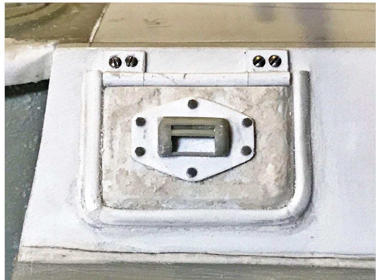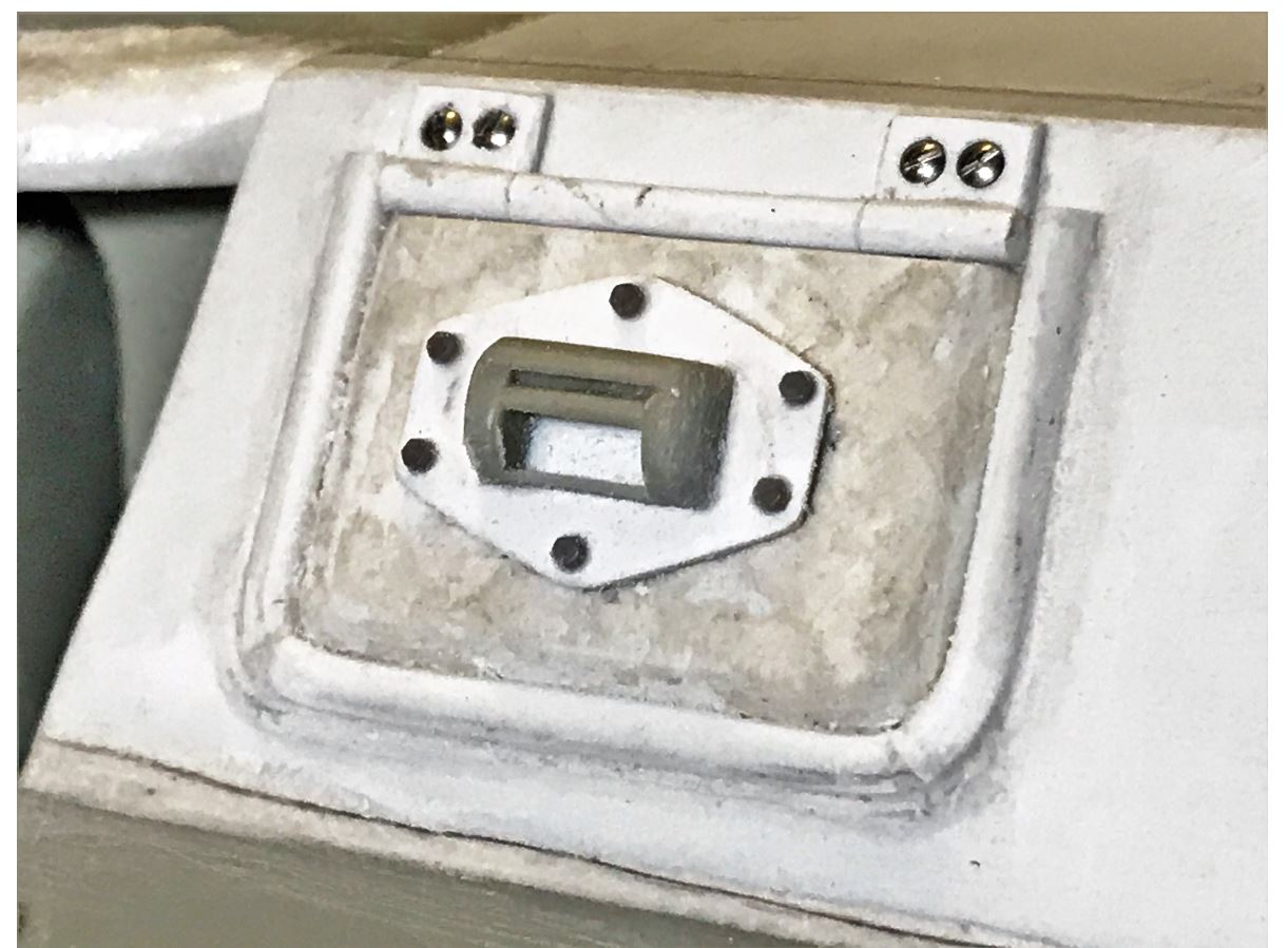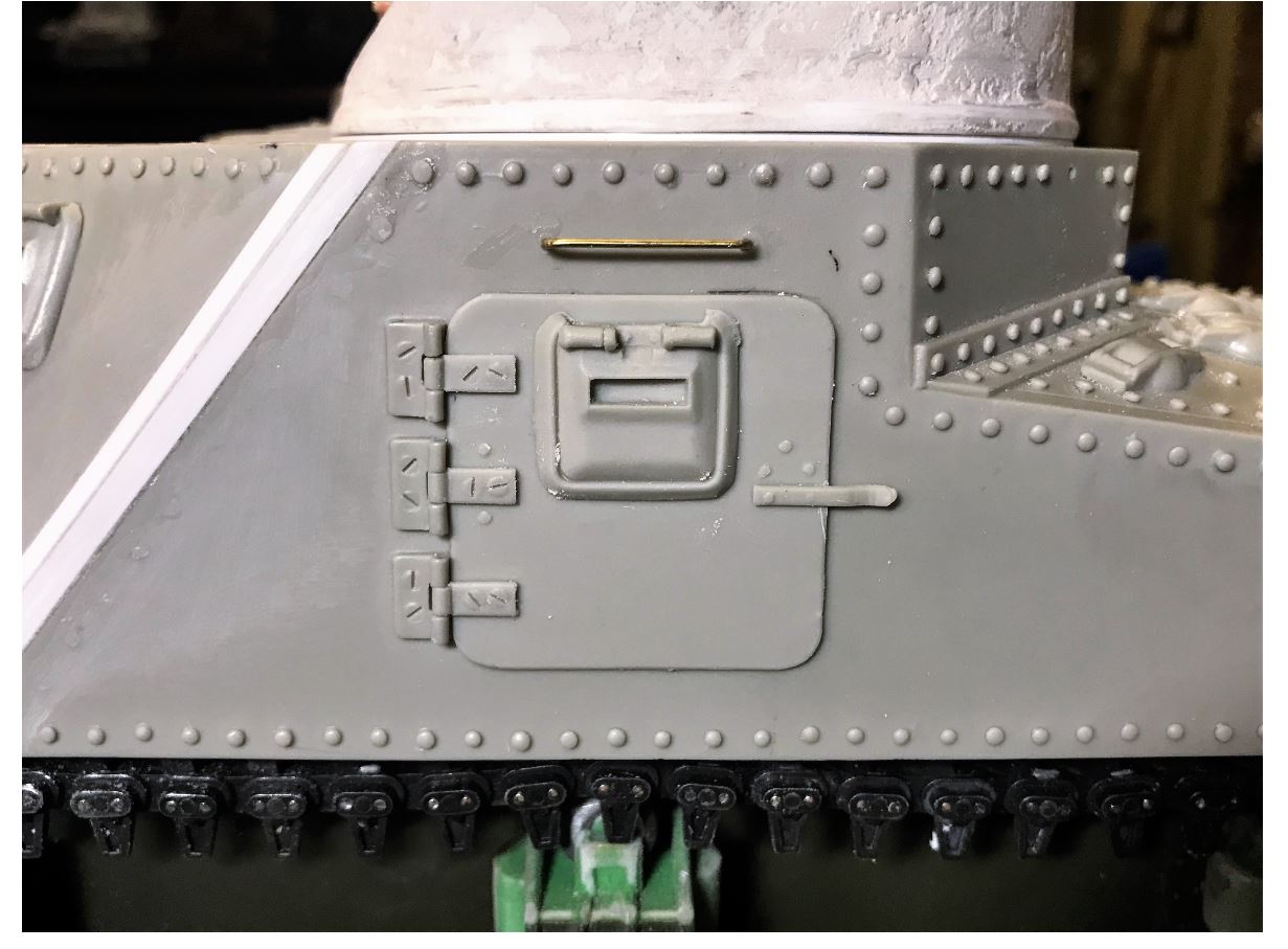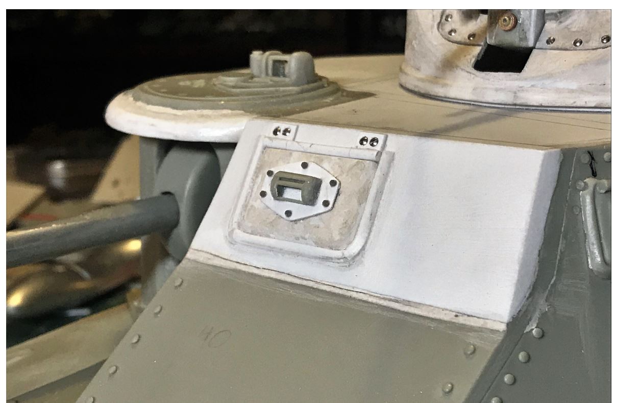 The Vandra driver's hatch was way undersized. It was obviously downsized to match the equally downsized top armored plate, squeezed between two rows of bolt heads. With the armored plate of the right dimension, it was obvious it needed replacement. Exact measurements for it were extrapolated from the Miniart kit. It was not made functional as the gun traverse servo is right on the other side.