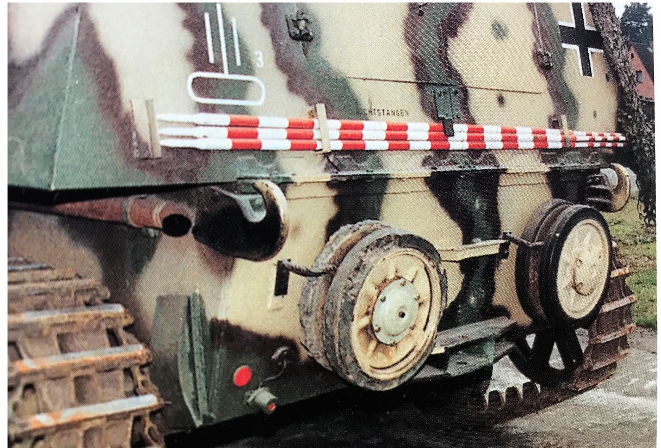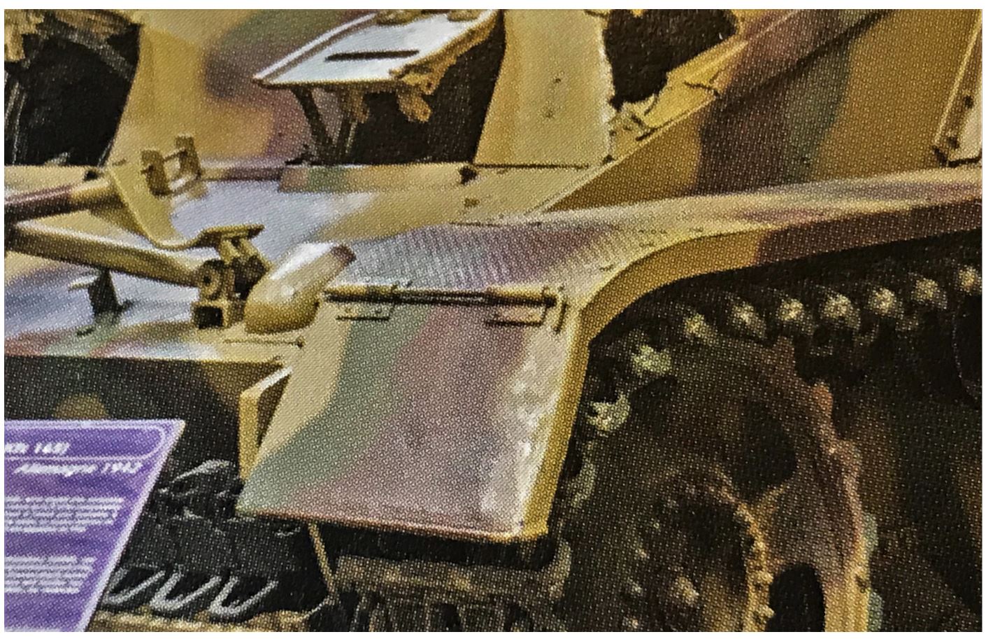 The Hummel late production is equipped with all metal return rollers. The mount are also positioned very differently than a Panzer IV. Notice the light slope of the track from the top of the sprocket all the way to the top of the idler. Also notice the armored box in front of the side air intakes, something rarely seen in reference pictures.
