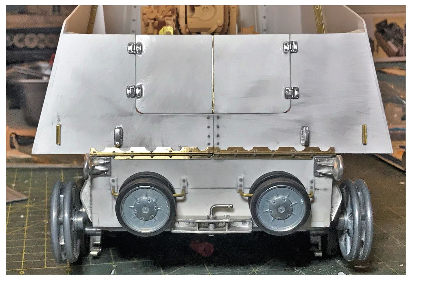 As it is important to feature panels that can be opened and closed, i took the time to create working hinges from metal ones purchased from Dioramaparts on ebay Germany.