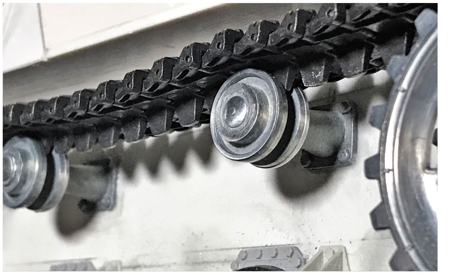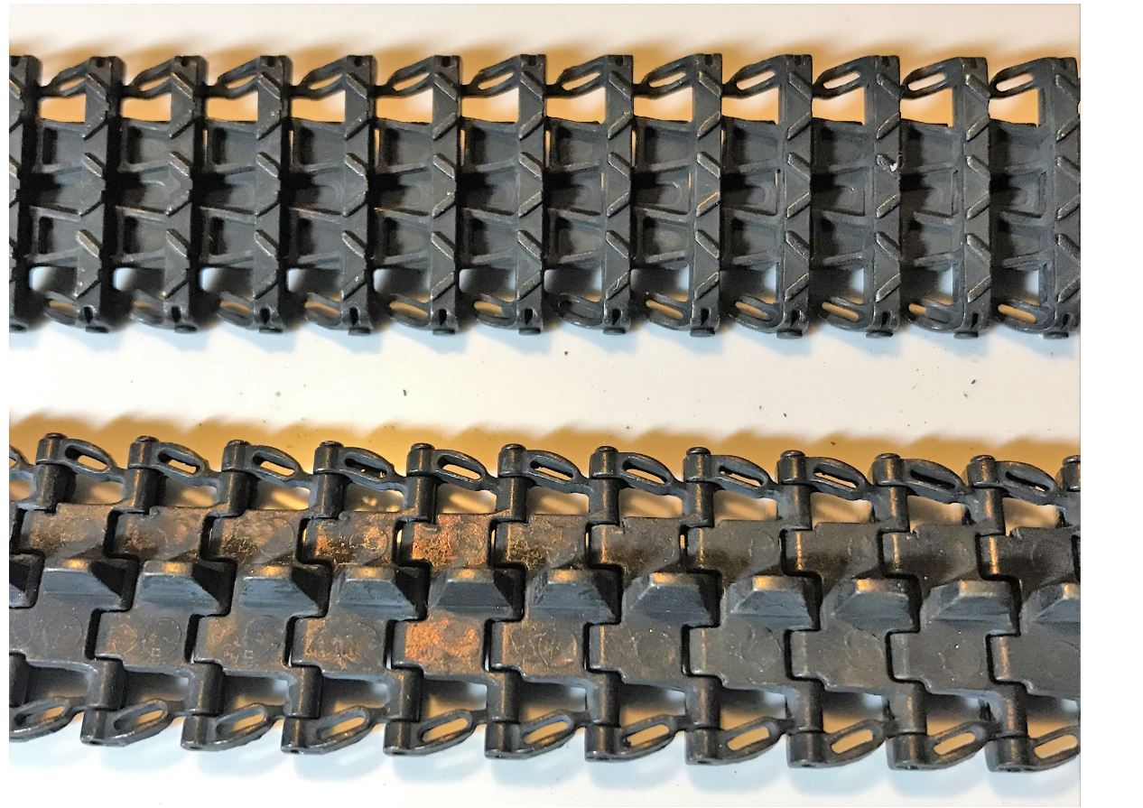 These are the superb and relatively cheap Mato MT011T panzer IV metal tracks (black pre-painted), purchased from eBay China for about $55. Notice the great level of details compared to Heng Long plastic tracks. They come with track pins with heads that allow for easy manipulation. Whoever has tried to remove track pins that are fully embedded inside a metal track link know what i am talking about. I do not think i will ever buy another set of Panzer IV tracks than these.