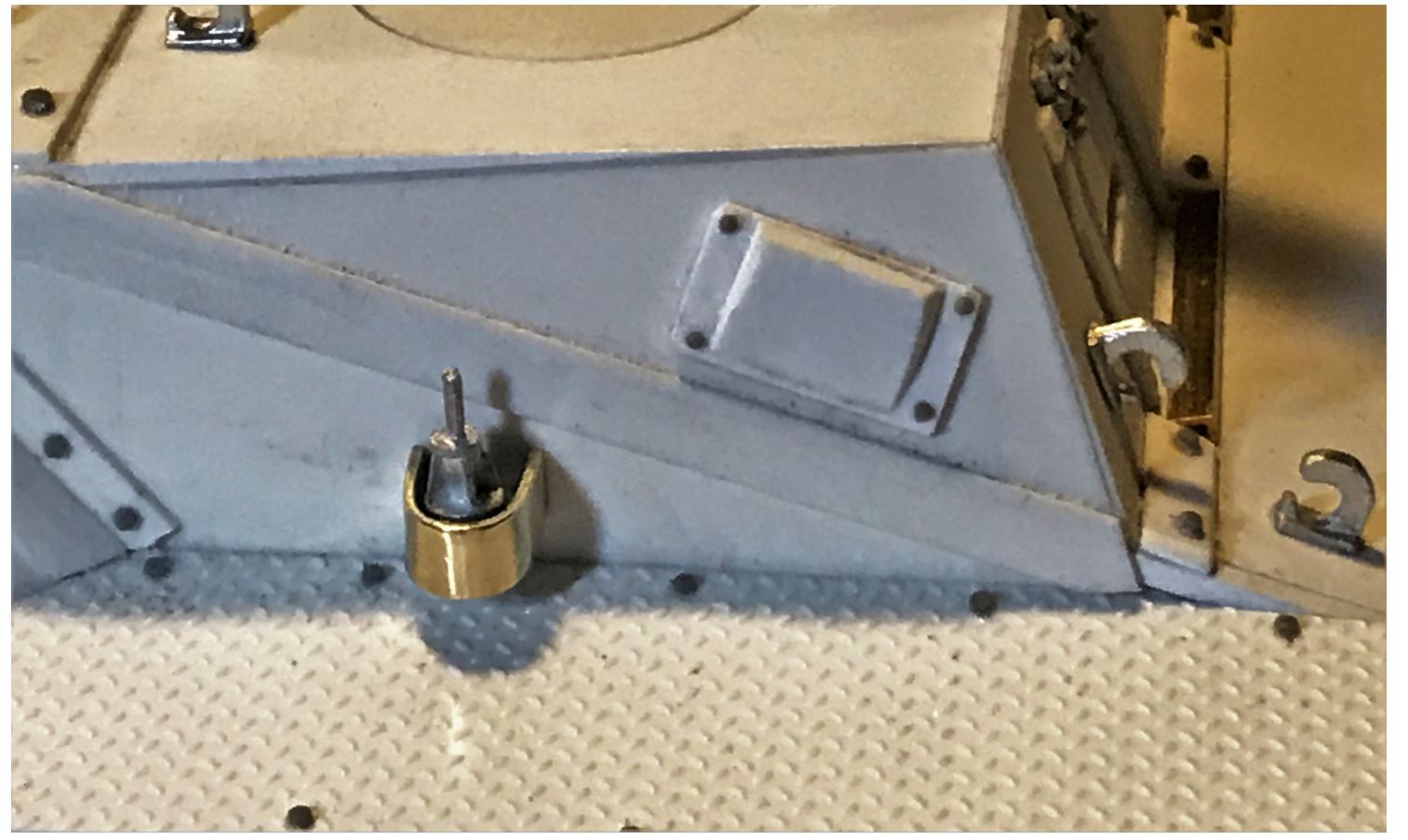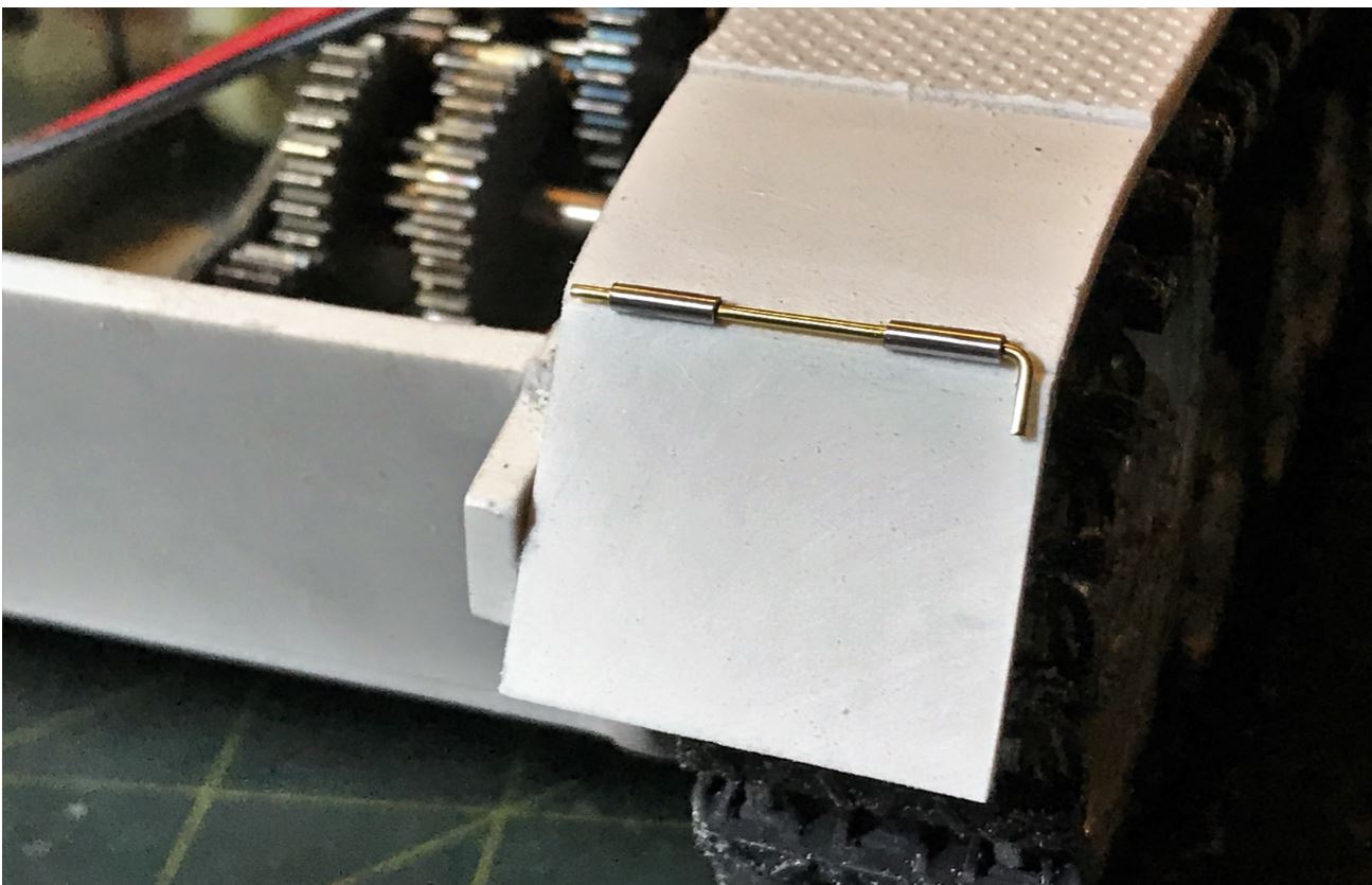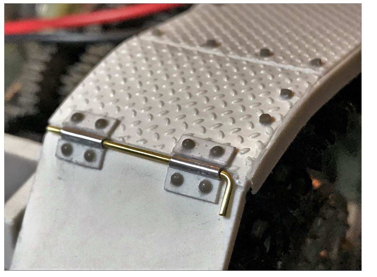 Close up of the hinge. Kit producers always oversimplify this area. Even Tamiya can't get it right. It is very easy to reproduce with a lot more accuracy in about 30 minutes of work with simple tools and material. But i can see that the bolt heads i selected for the hinges are a bit too large, i will have to replace them.