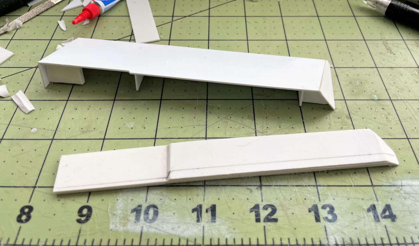 There is the added complexity of ensuring the hull top can still be opened. So the whole bins cannot be glued together and simply put on the sides. I kept the top loose and that is the section that will be glued to the roof top while the main section is glued to the hull side.
