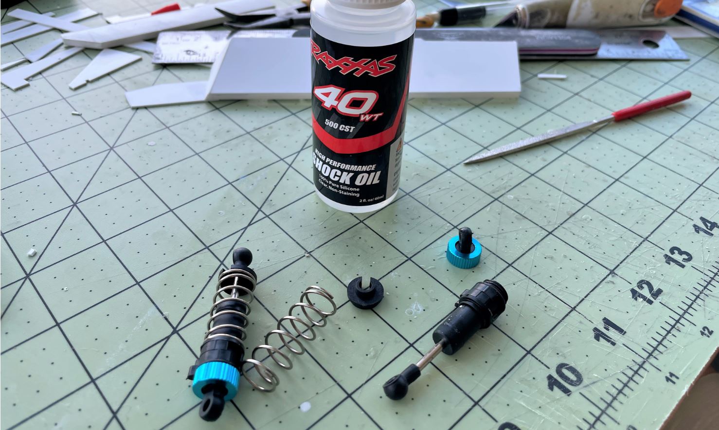 The container of each shock can be opened and were filled at 3/4 with Traxxas 40 WT (500CST) shock oil. I had the choice of a WT of 10 to 90, the higher the thicker. As i had no idea what was the best for this vehicle, i just picked the middle 40 and will be performing road tests with it soon enough.