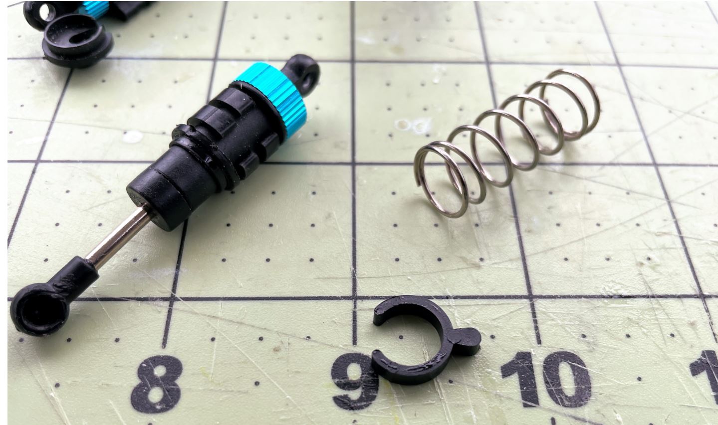 These are oil shocks absorbers but I noticed that they are not filled with oil. There was only a bit of oil put inside to lubricate the piston, but not optimally. I therefore decided to fill them with shock oil for more effective shocks. Keep in mind it’s the spring that still provides all the force.