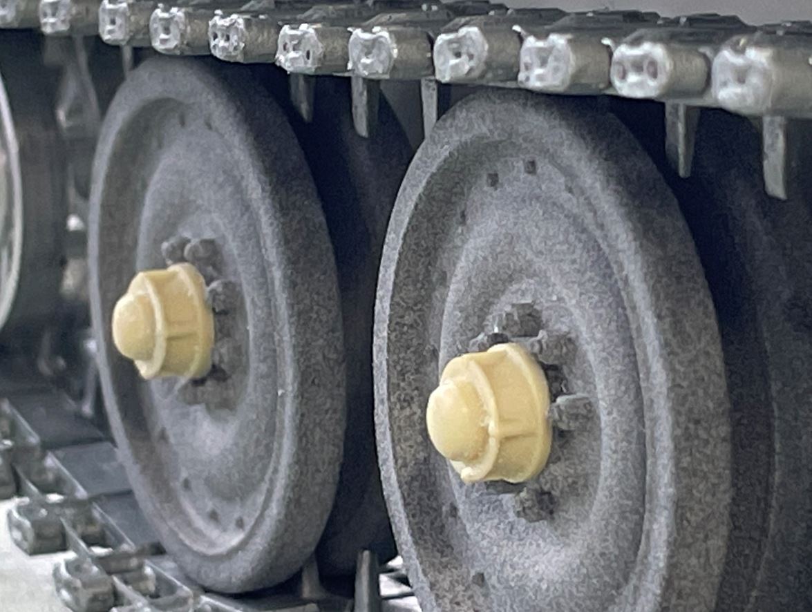 Close up on the primed Ludwig M113 roadwheels with modified Tank Modellbau hub caps. I am very satisfied with the overall look and detail of the roadwheel with the new material that Chris used. It's a real improvement.