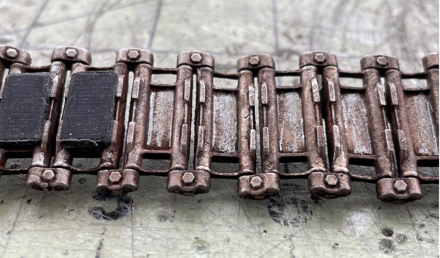 The metal tracks are given a coat of Mig Ammo Track Rust wash for weathering. The rubber pads are prepared by giving them a good sanding to remove the newly molded aspect. These tracks should look worn out.