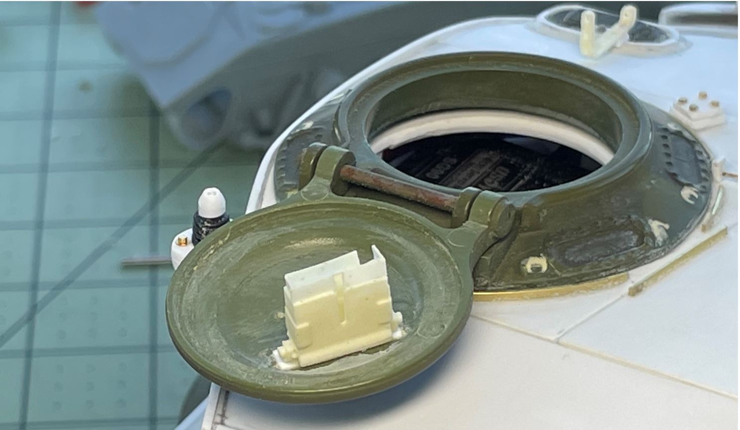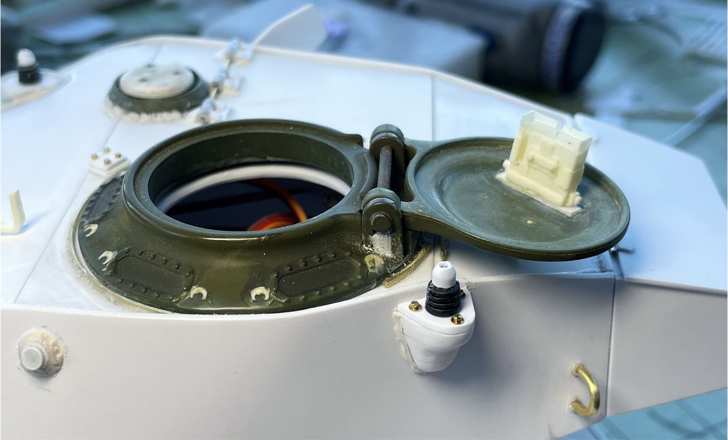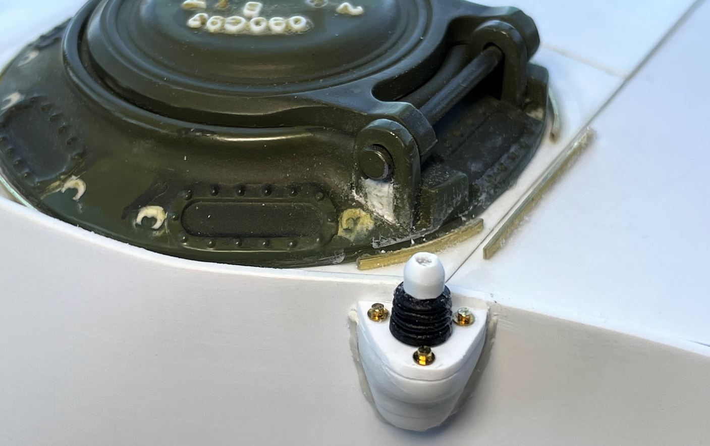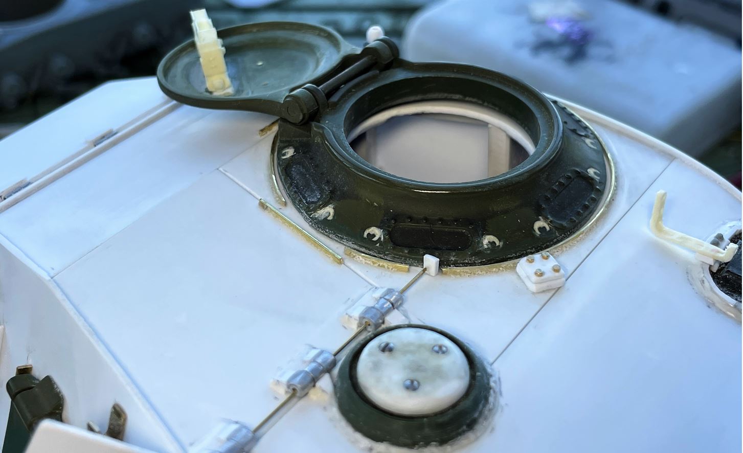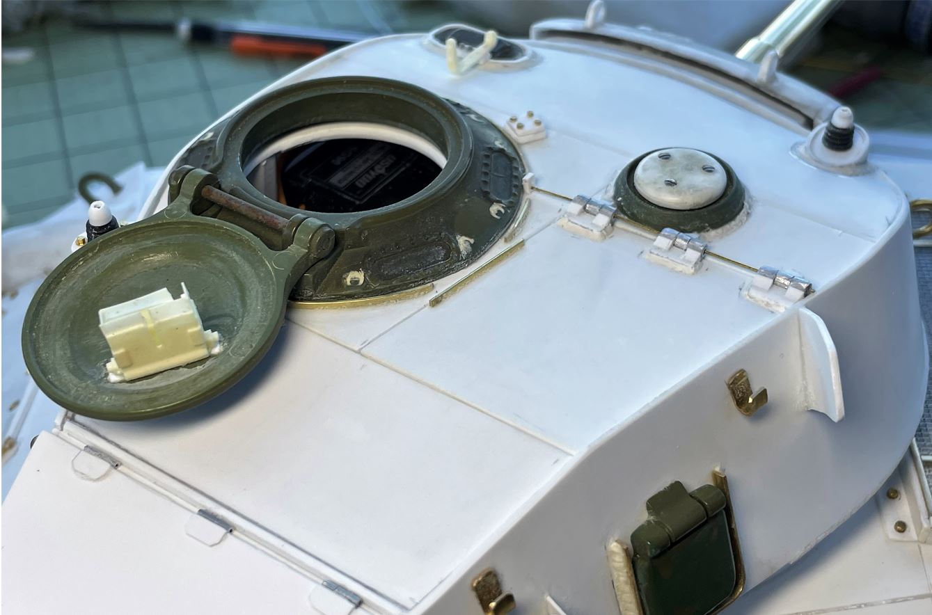 The turret ventilator cover and close up on the gunners hatch hinge. The rim around the ventilator is taken from a Heng Long Sherman turret and significantly reduced and refined.