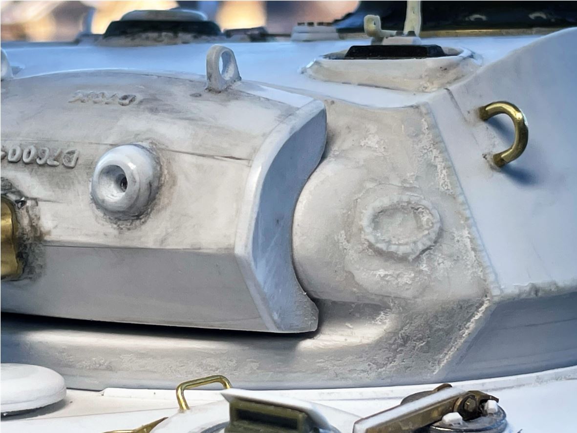 The frontal cast section of the turret was given layers of superglue that mimics cast texture. it will be more apparent when the model is painted.