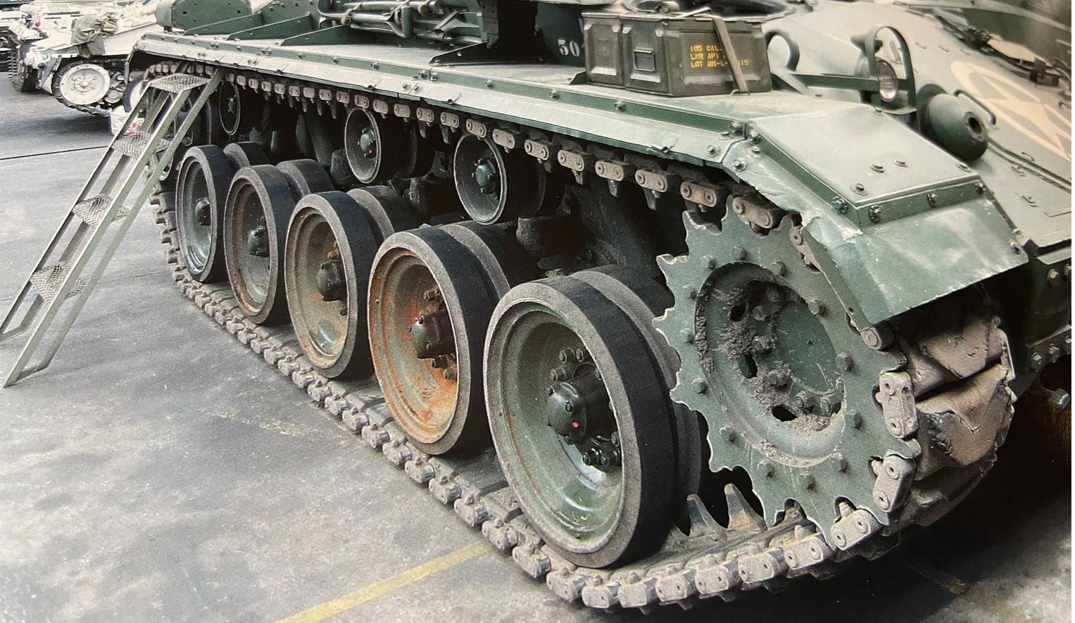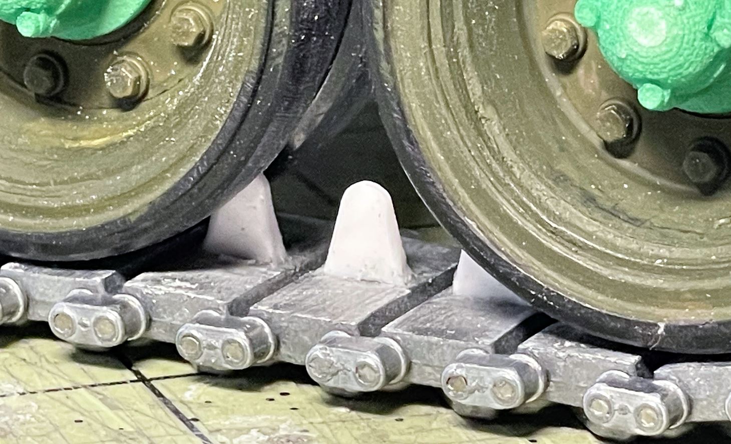 From the outside, the Chaffee T85E1 tracks and sprockets are similar to the Sherman T48 tracks with rubber chevron with the exception that it has a single tooth in the middle instead of two teeth located on the side connectors. Important here to note is the width of the roadwheels within the tracks. The wheels do not extend over the connectors, which explain why i had to reduce them in width earlier on the build.