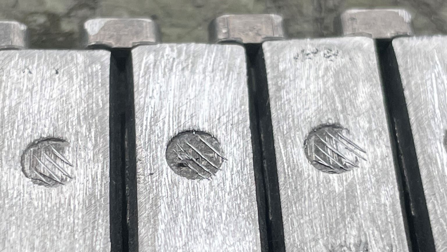 I thought of getting rid of the hole on the pad with more sanding but then i decided to make use of it. In order to give more strength to the teeth, a few deep scratches are done in the metal, this will give a better anchor for the superglue. The hole is then filled with superglue and a tooth is placed over each, extending to the front and back. The hole center serving as a location point, ensuring the teeth is centrally positioned.