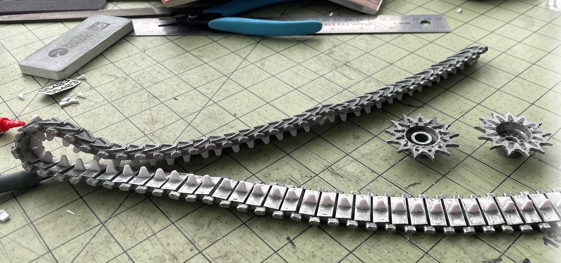 To fit the tracks on the metal sprockets, I had to reduce the width of the sprockets by removing about 2mm on the central connection between the two halves, perfect fit now. I also sanded the chevrons a bit to remove the strait edge. I am pretty much fed up with metal sanding, but now its done.