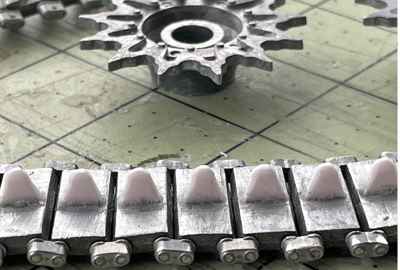 Plan B is to drill a hole 2mm wide by 2mm deep in the center of every track link, design and 3D print teeth with the 2mm anchor that will slide into the hole, and do it 146 times. I am really trying to avoid that.