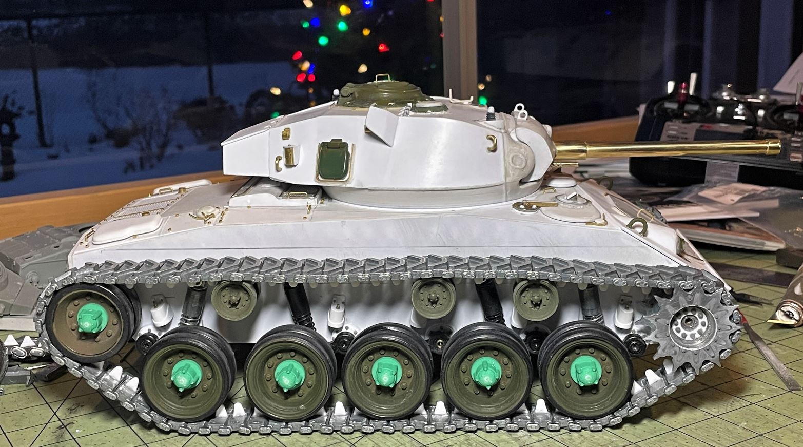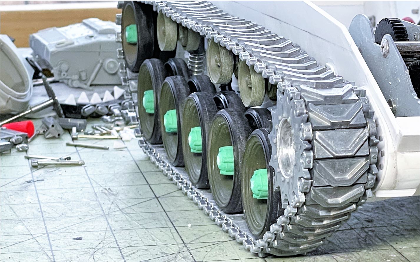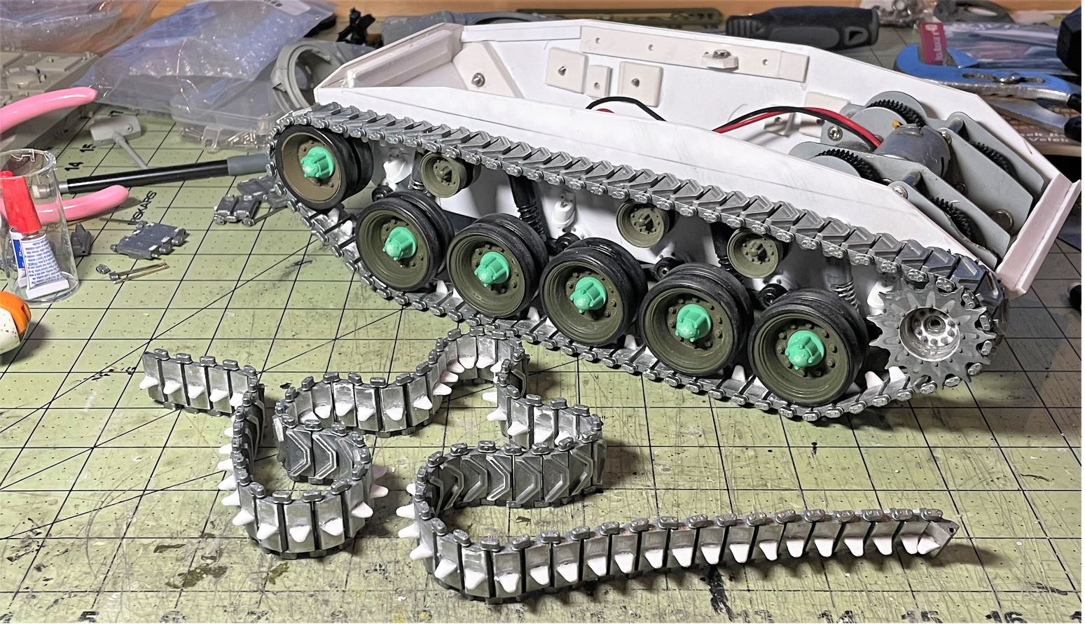 The other tracks before mounting. Notice the use of Shapeways 3D printed M41A3 Walker Bulldog 4 pin hub caps instead of M-26 Pershing 6 pin hub caps coming with the Heng Long road wheels.
