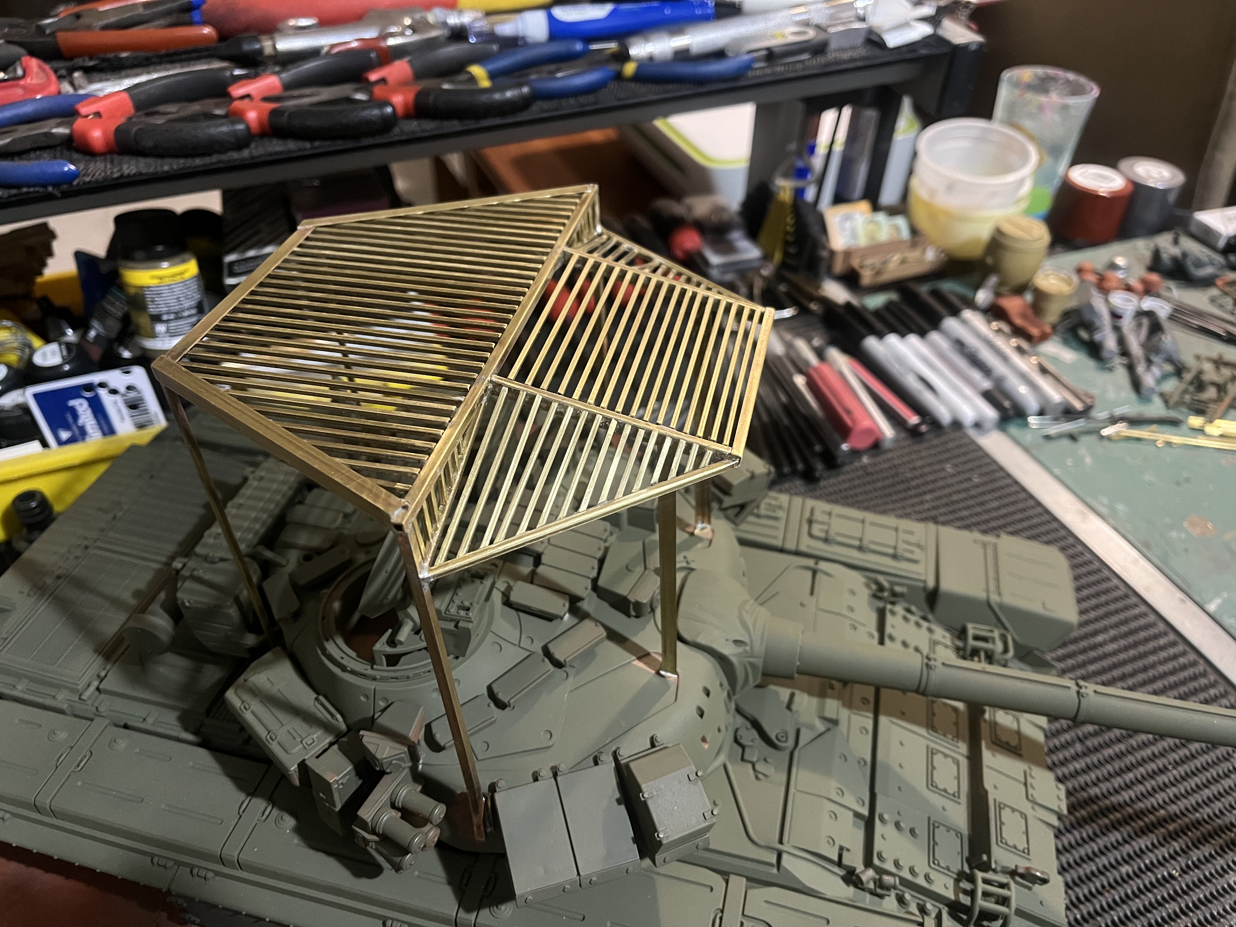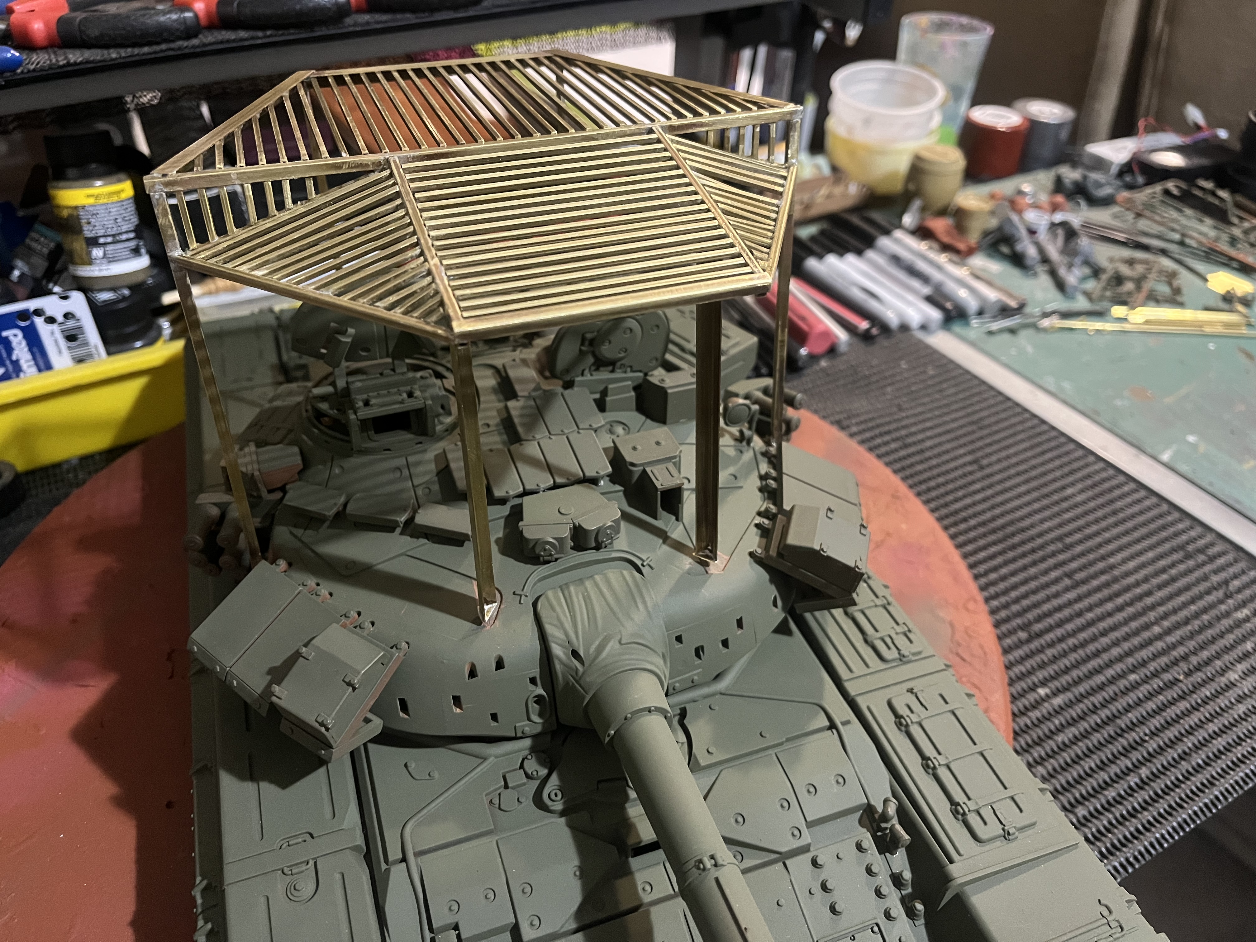 By the mass of sticky-outy bits all over the turret of this thing, and the yet to be fitted M.G. & 'Shtora-1' dazzlers, there's no way I will fit the cage & hope to paint and complete the turret build..............