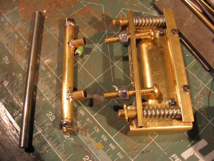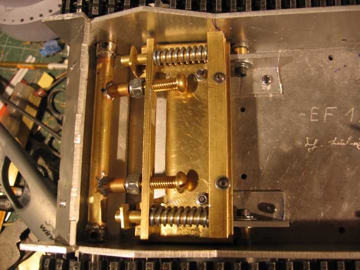 So with about 4 hours engineering and fabricating I came up with this system. Uses two 10 lb springs (which you canot compress with your hands), some brass sheet, 2x1/4 brass screws (trimmed) and some lock nuts. The screw adjusters are at an angle so easy to adjust with big screw driver and wrench. then the whole block the adjuster screws mount to also moves back under compression. Had to lengthen hull holes 3.5mm forwards. Also built brass carrier for front axle with set screws. had to trimm axle so that stubs only project from hull 10mm on each side.