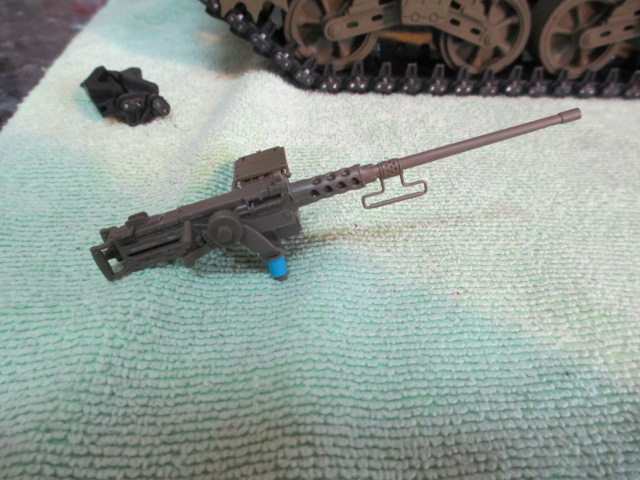 Tonight saw some things done and checked off of the build list. To begin with, I removed a link from each track and corrected the excess slack I had noted the night before. After that I used a small section of shrink-to-fit tubing and got a nice fit for the Tamiya .50 cal in the Mato loader's hatch pintle mount. After that, I drilled the idler wrench mount and made a small handle for it (as I had threatened to do earlier on) Lastly, I tackled the installation of the sound pot from Immortal Hobbies. Pictures: