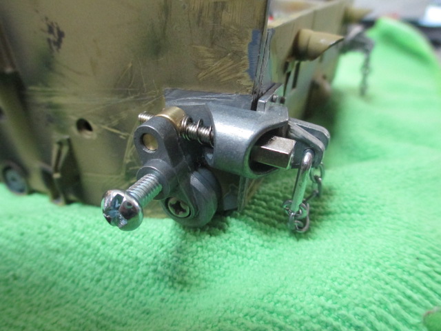 Got some more done today. The metal return rollers are in pieces when they arrive so as a word of caution I suggest looking at the original plastic pieces or an assembly template to make sure that they go on the new axles oriented in the right direction. Once mounted and the tiny nuts threaded on, a drop of Loc-Tite will help ensure that the nuts don't take a trip into the gearbox later on. I finished off the day's work prepping the lower for painting by puttying up the extra screw holes and trimming off the unneeded 'G' type front shackle mounts. The mufflers had broken while being removed so a little drilling and some pins saw them securely reattached. On to priming tomorrow. Pics: