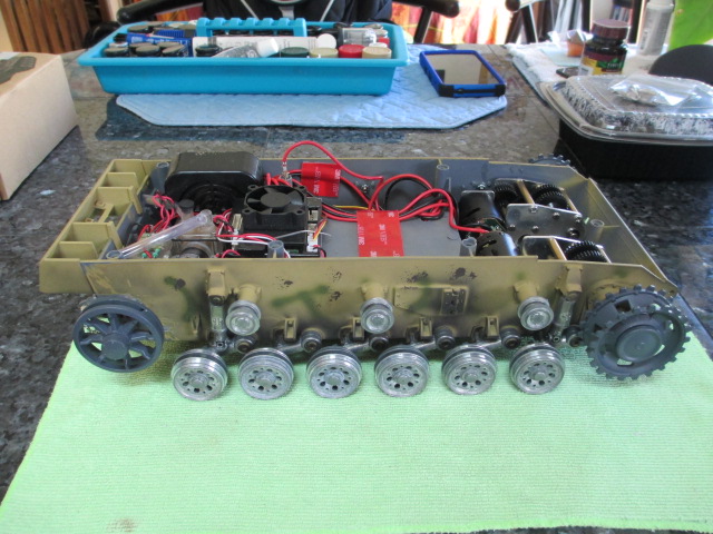 Still raining here so spent some time last night assembling and installing the roadwheels. Really makes a difference in the weight of the lower hull. These are nice quality pieces from Asiatam sold through Taigen. I removed the rubber in anticipation of prime and paint which will hopefully take place as soon as the sun shines. Pics: