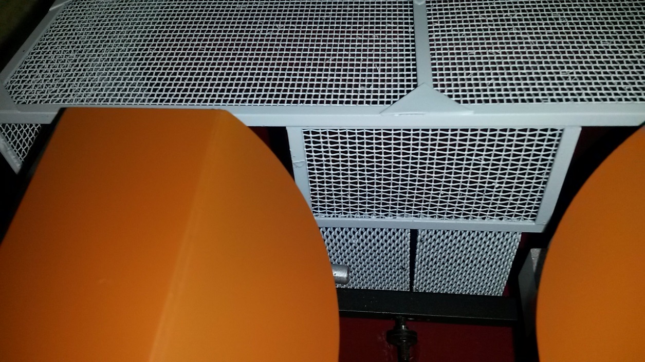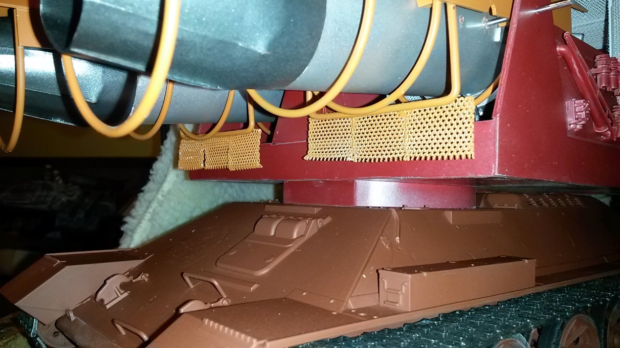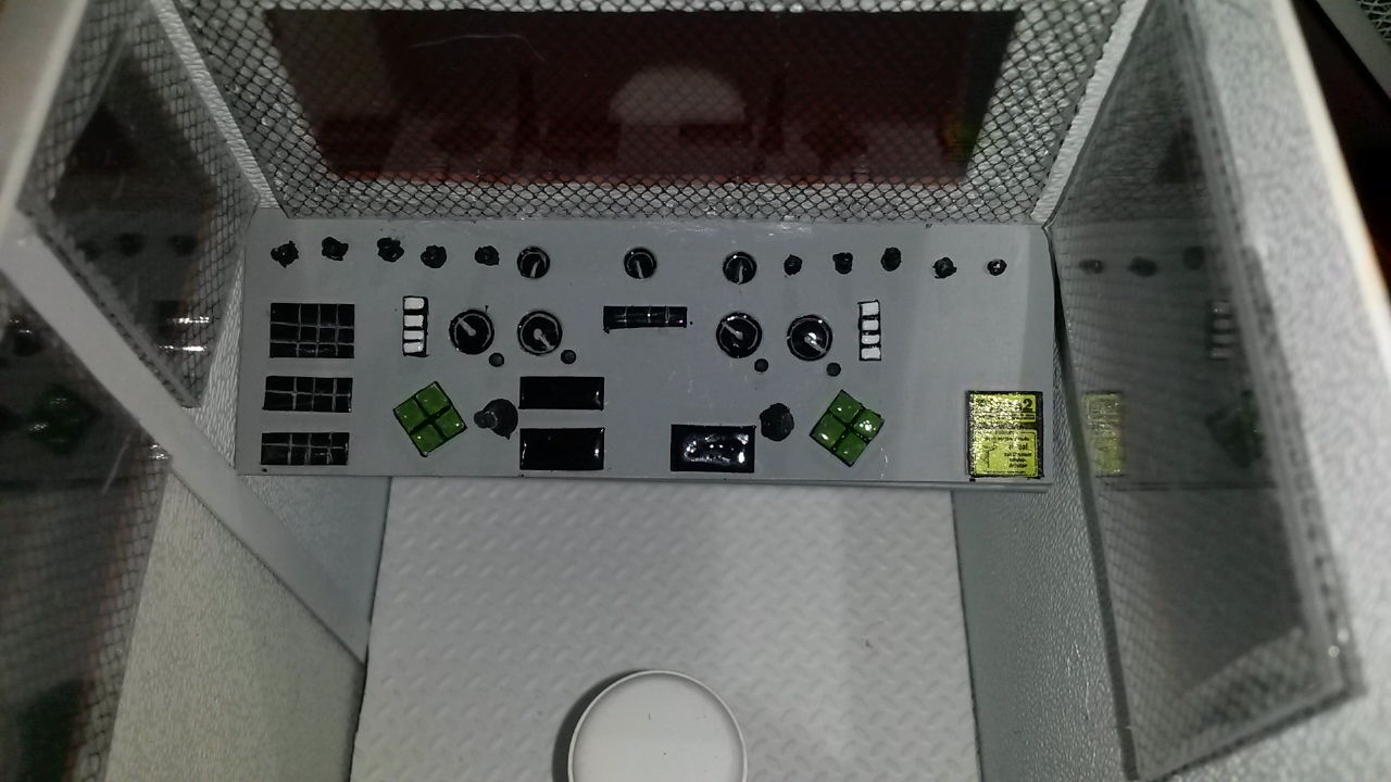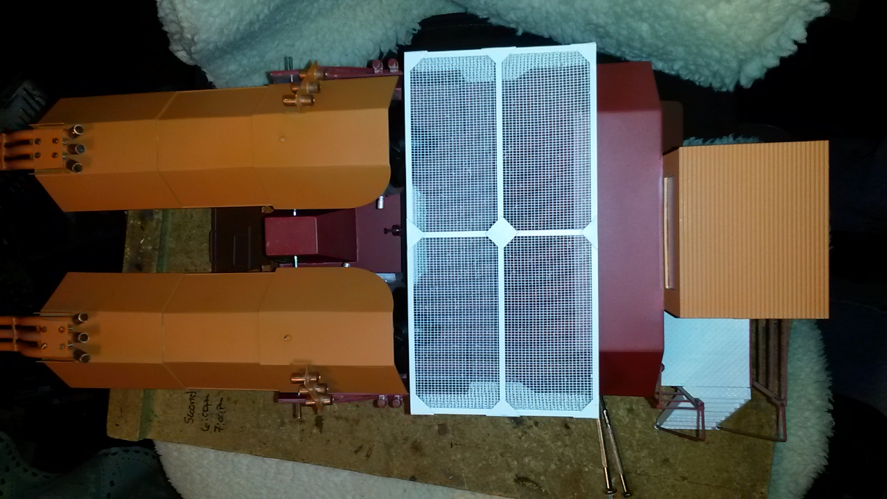The side panels looked a bit bare, so I decided to make up some "busy" panels. I found some parts in the scrap box that looked like industrial hydraulic filters, so on they went.