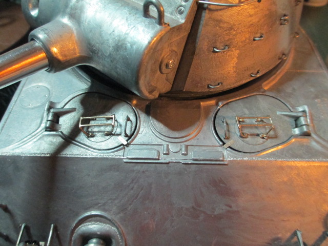 More detailing fun tonight. Nothing in the Post so I looked at the two working hatches and did a little research in the books and online. Some of the best photos that I can find with the hatches open show no leather pad on the hatch underside. That's a bit peculiar but maybe it had something to do with the 187 representatives of this make being hurriedly assembled and rushed to combat. Otherwise the hatches are like the standard M4A3 types and as I had a supply of brass, I spent a couple of hours on them. Pics: