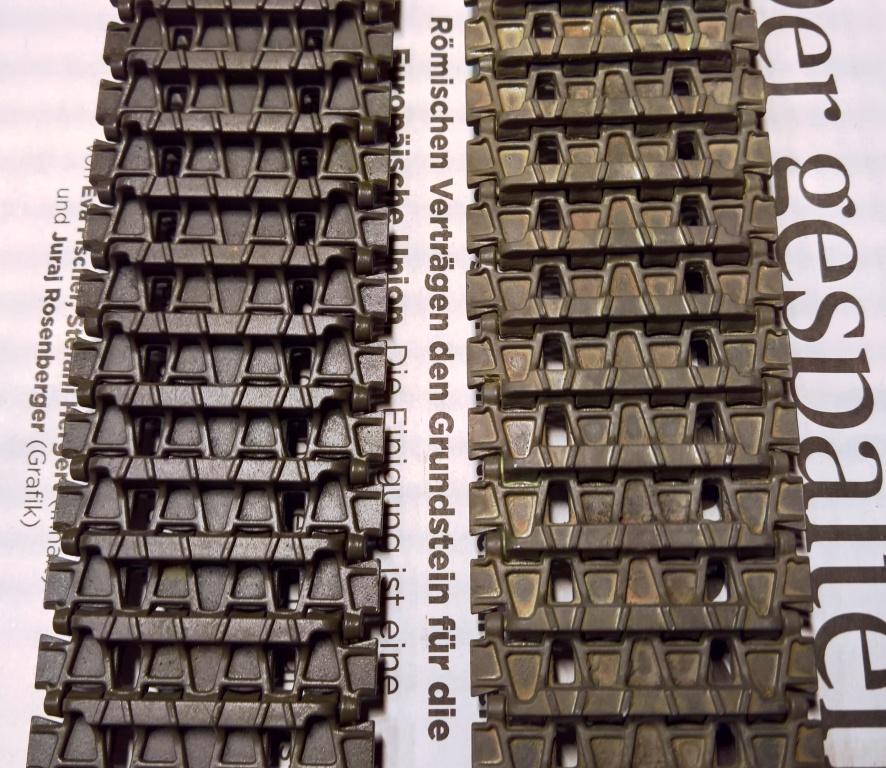 Right is the second step of Grime: yesterday I added Vallejo washes, Desert Dust (522, all over), added Patches of Vallejo European Dust (523, my preferred reddish Dust wash) wash and the odd spot of Vallejo Engine grime. Then I blotted in Wilder Pigments European Road Clay (GP-10) and Dark European Terrain (GP-09). Ditched in Vallejo Oiled Earth wash in the Center here and there (521). 24 h later i Mixed some watered down Desert Dust Wash either with one of the 2 Wilder Pgements and more or less washed the inside and than brushed the rests shallow over the outside of the tracks. When this is all dried, I will give it a rubdown where needed and fix it with several layers of dull Varnish.