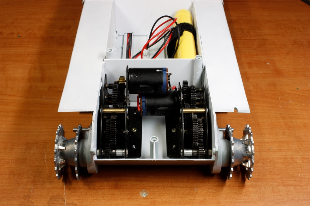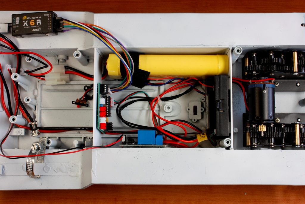 Eventually I mounted one hull brace instead of two. The bolt heads underneath are shallow-domed, so they should prove inconspicuous. I notched the brace slightly to clear the RX18. You can also see the receiver is hot-glued in place now, and there is a speaker underneath the electrical panel. I’m still thinking about whether to make a speaker enclosure under there or keep it modular.