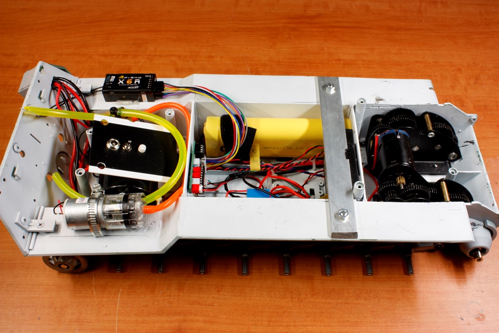 Next is the central compartment which houses the battery and the RX18, which is attached to the front bulkhead. As the Panther is a 27MHz model, I got one of Kevin Grannum’s latest RC5HL paired up with a Taranis Q X7 radio with both sticks self-centring, and a 6ch receiver. The RC5HL is still loose in the photo. The new RC5HL allows you to use relays (the blue component at right side of tank) to block the track recoil activation. As I've said before, I know stuff all about RC, so I got Kevin to set it up for me with ER9X, and all I had to do was solder the relay unit using one of the spare leads Kevin threw in - great service.