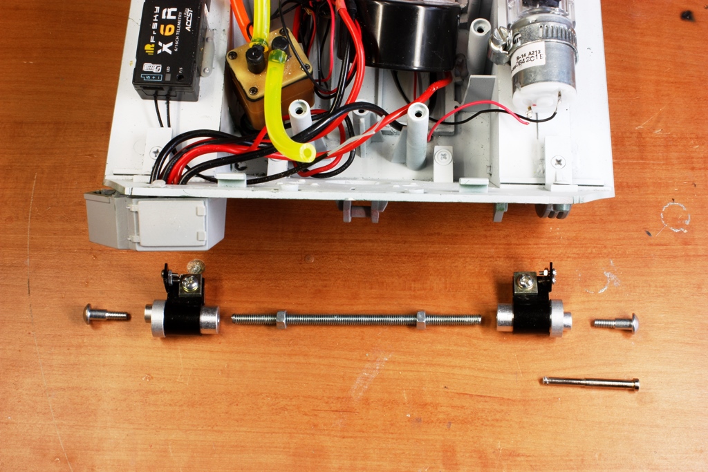 Then I fitted the adjuster clamps, which thankfully could be installed without needing to move the smoker heater. But the bracing rod won’t clear the rear hull securing brackets, so I’ll leave it out. The plastic moulding of the rear axle supports do this job anyway.