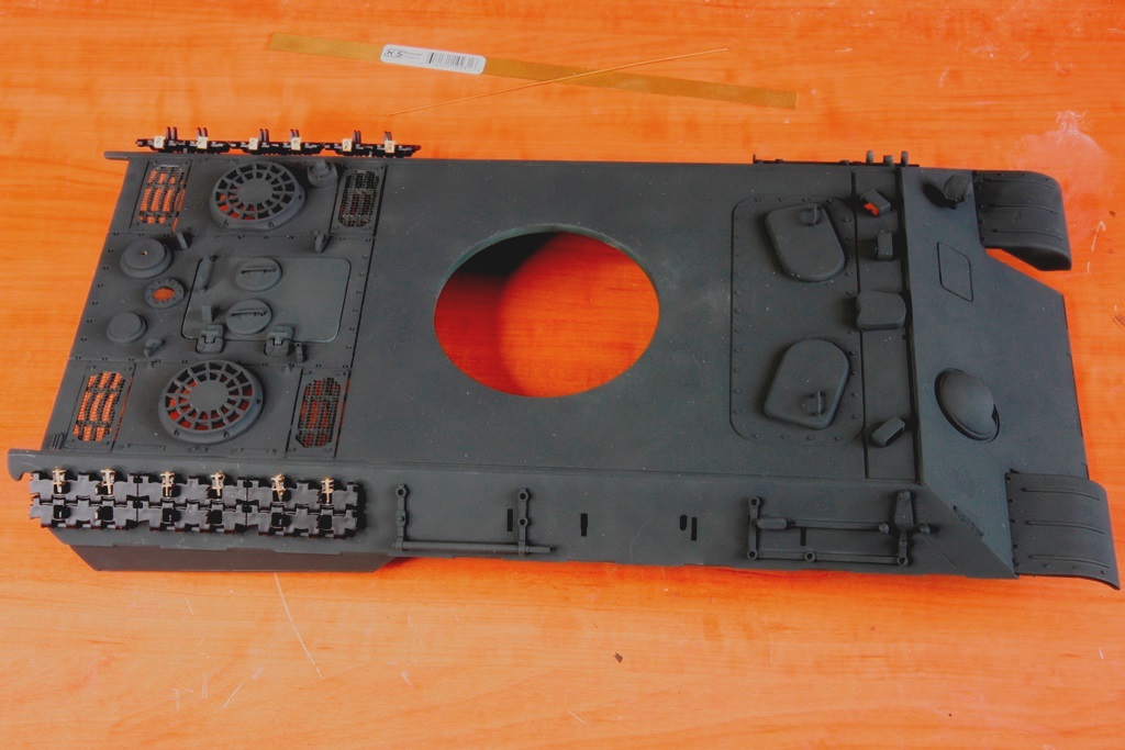 Then the rear compartment, which answers Raminator’s questions. The engine cover lifts off the hull, which will allow me to access an electrical panel with a socket for charging, the smoker switch and volume pot. The RC5HL is now secured with plasticard C-section which, like the bulkheads, can be slid out for access.