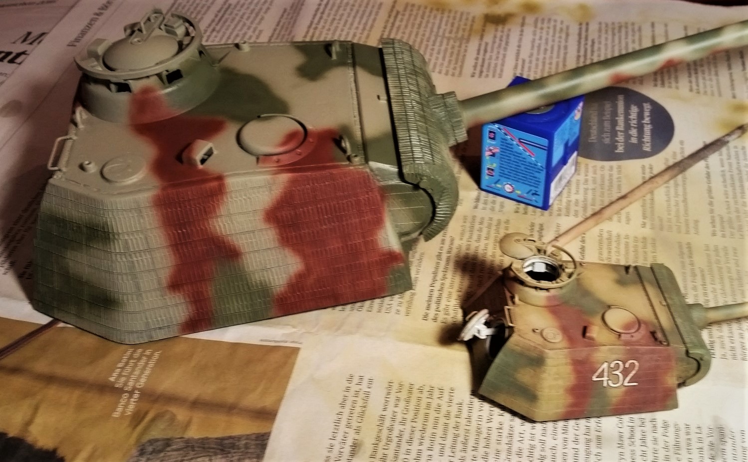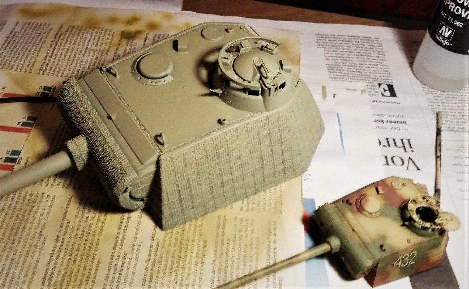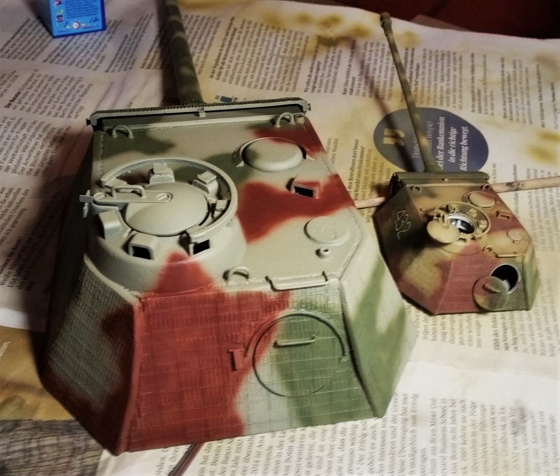 Anyways, although it has some yellow I it, it doesn't show too much. Most of the Panthers we see build are based on the Dunkelgelb proper. So this is something different. I like it like that. The green is revellers olive green. Which is more green compared to the Vallejo 6003 you can see on my Jagdpanther. Gave it a highlight by adding some drops to the 1001/Light remains. Goes more intof the MIGAMMO dark Research. But I like it together withe the 8012. Will see what filters can do. But that may take a while. Yesterday I fetched the Tiger hull from the shelf. That will get some attention during the following weeks until the Panther feels like something new