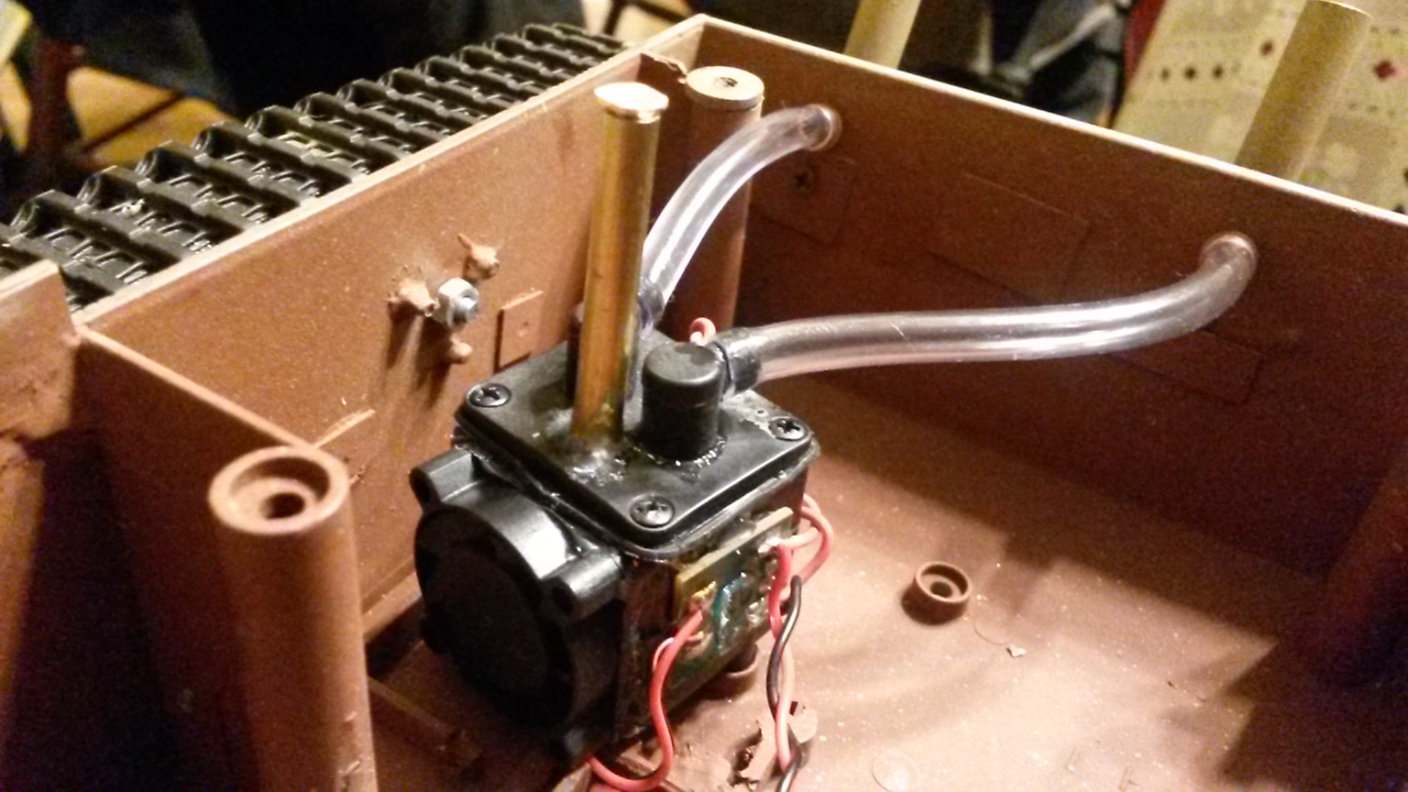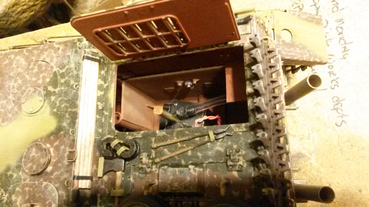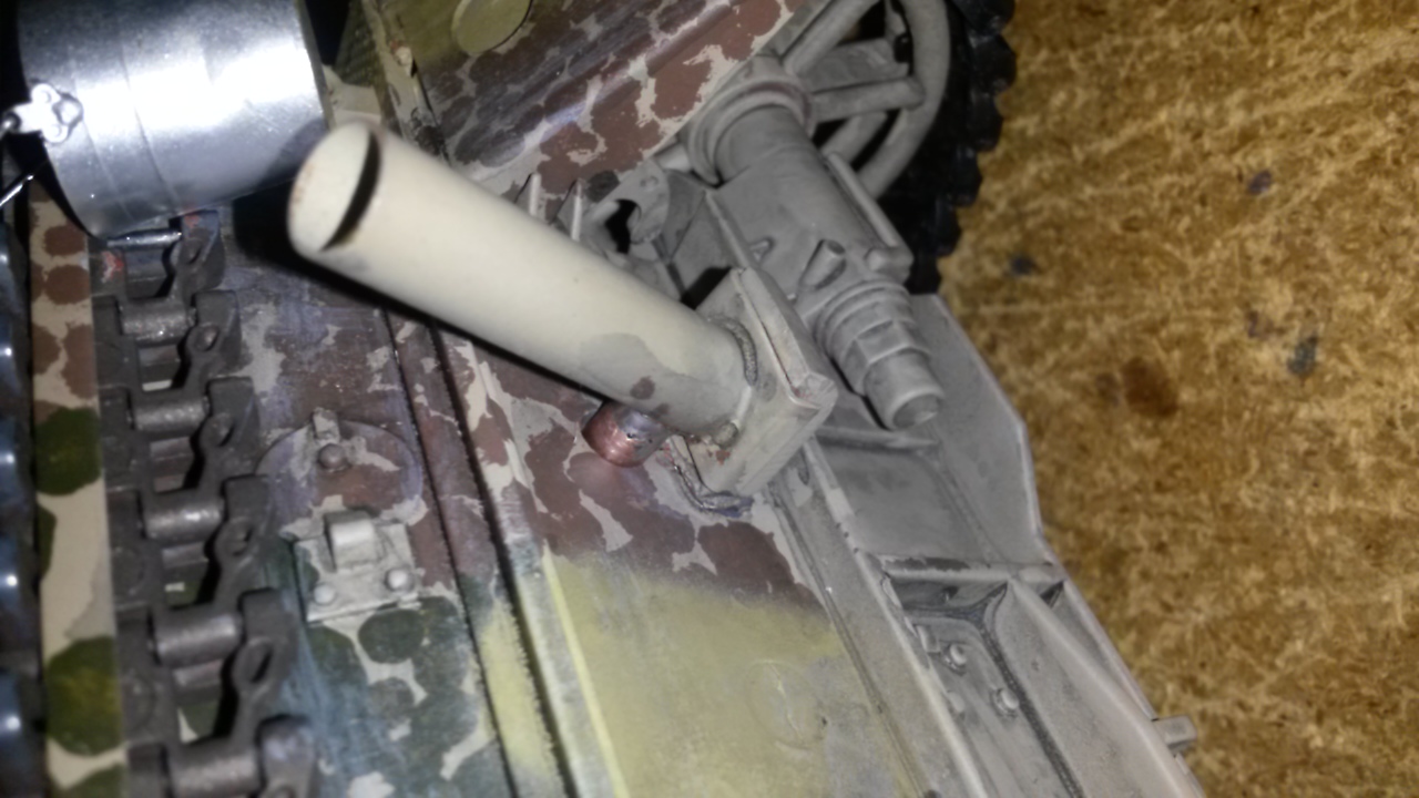 I drilled from the inside of the lower hull into the exhaust tubes and added brass tubing to get the smoke out. Still have to paint and rust up this area.