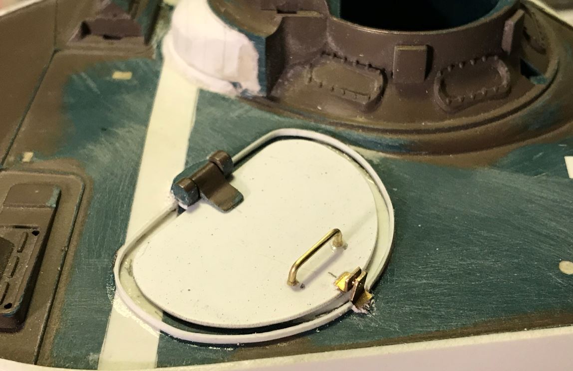 A new hatch is created using measurements from the Tamiya kit with formula; Tamiya dimension divided by 1/35, then divided by16. The rain guard need to be sanded lower a bit. I reused the Heng Long hinge.