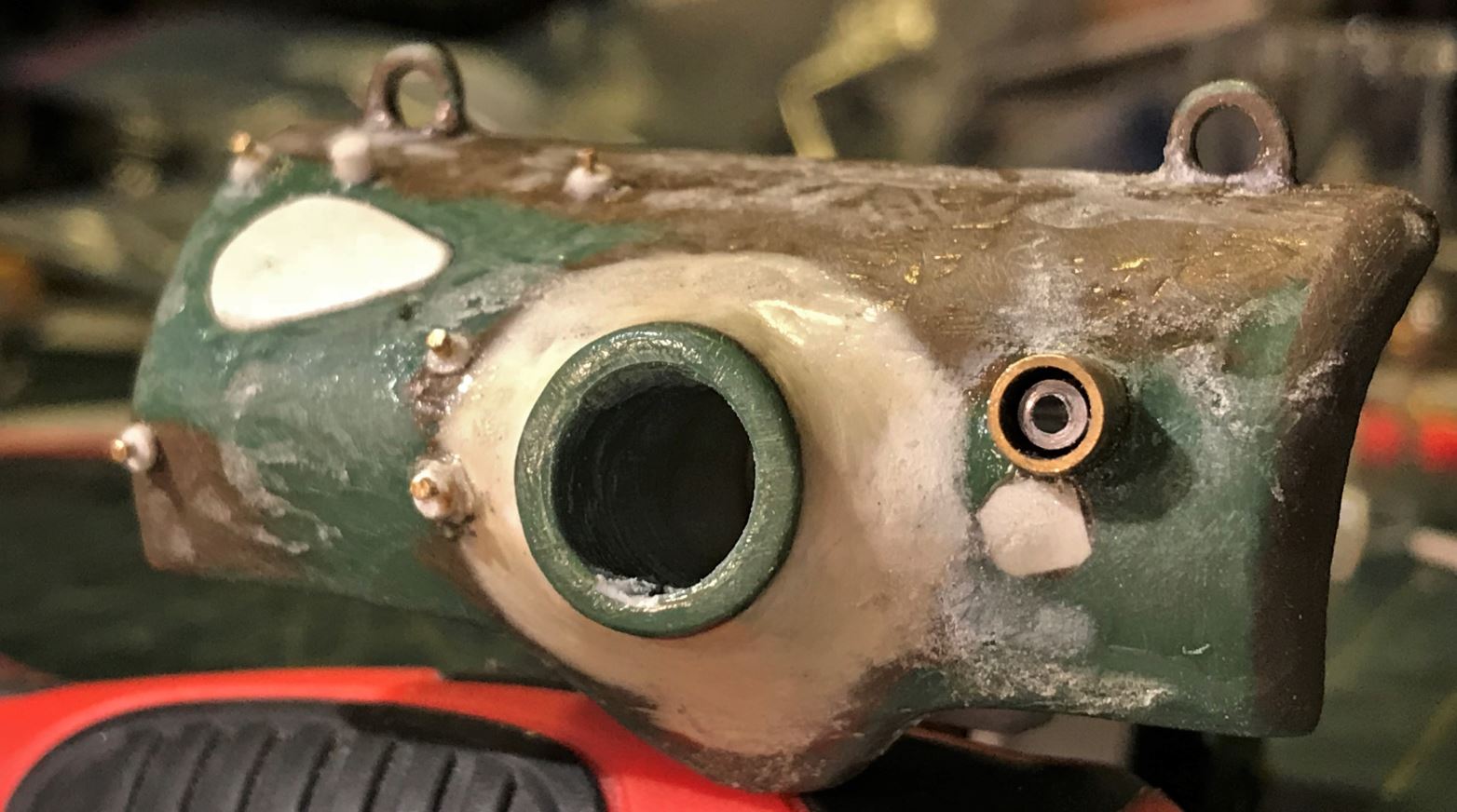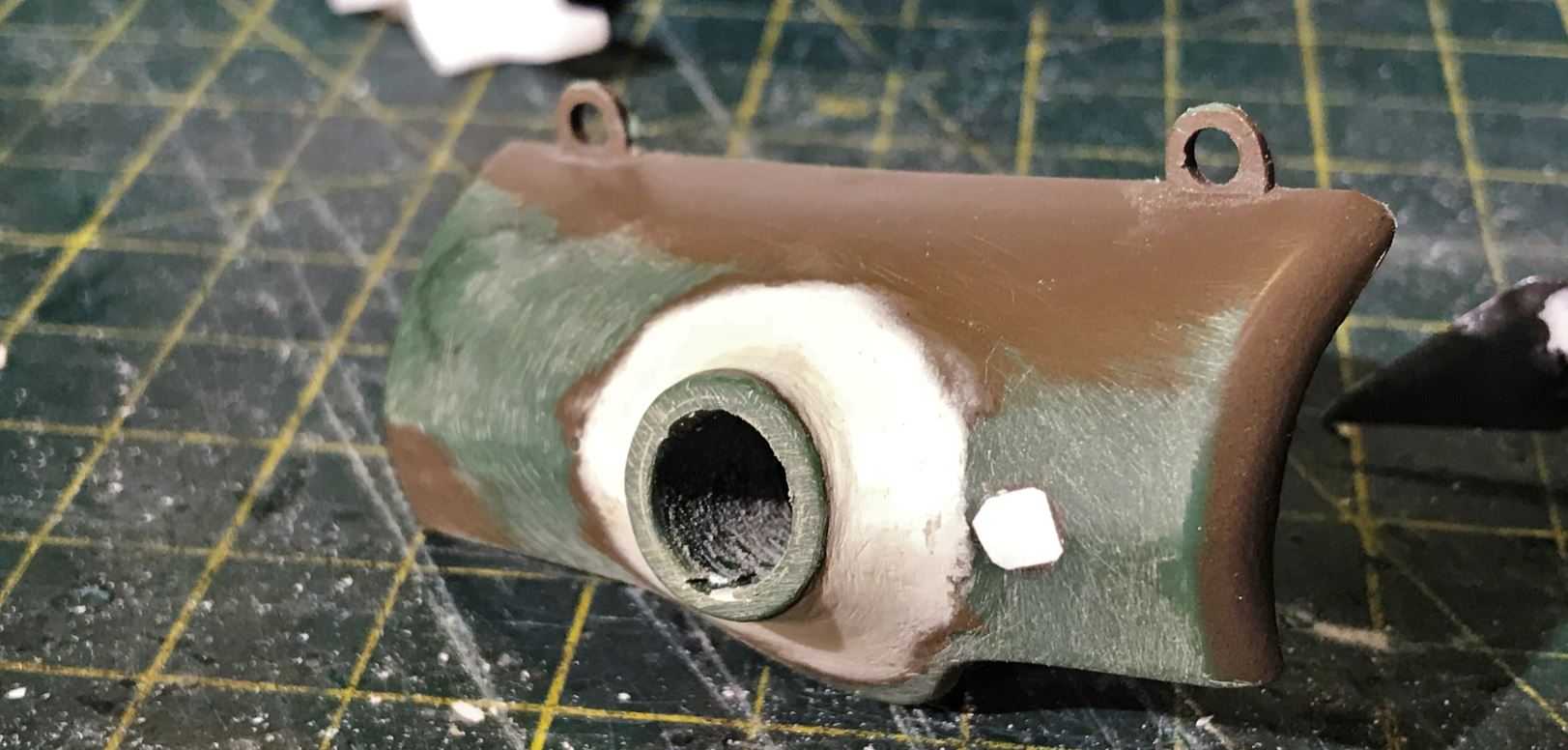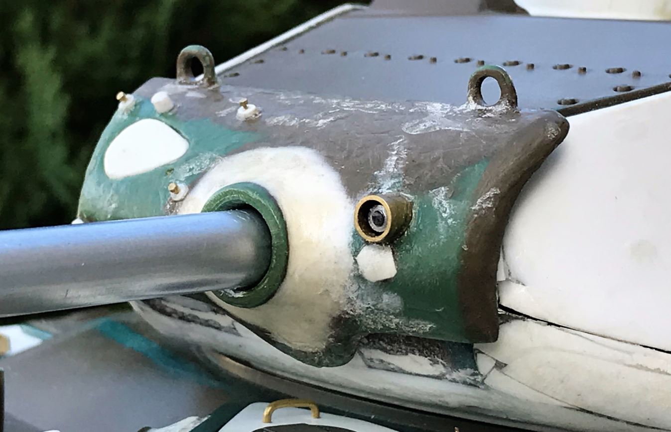 The new mantlet is ready. I looks rough because a layer of superglue was applied on the surface to reproduce a light metal cast effect that will look good once the part is painted. The coax machine gun is made of an exterior 5mm brass tube and a 3mm aluminum tube that simulates the .30 MG barrel.