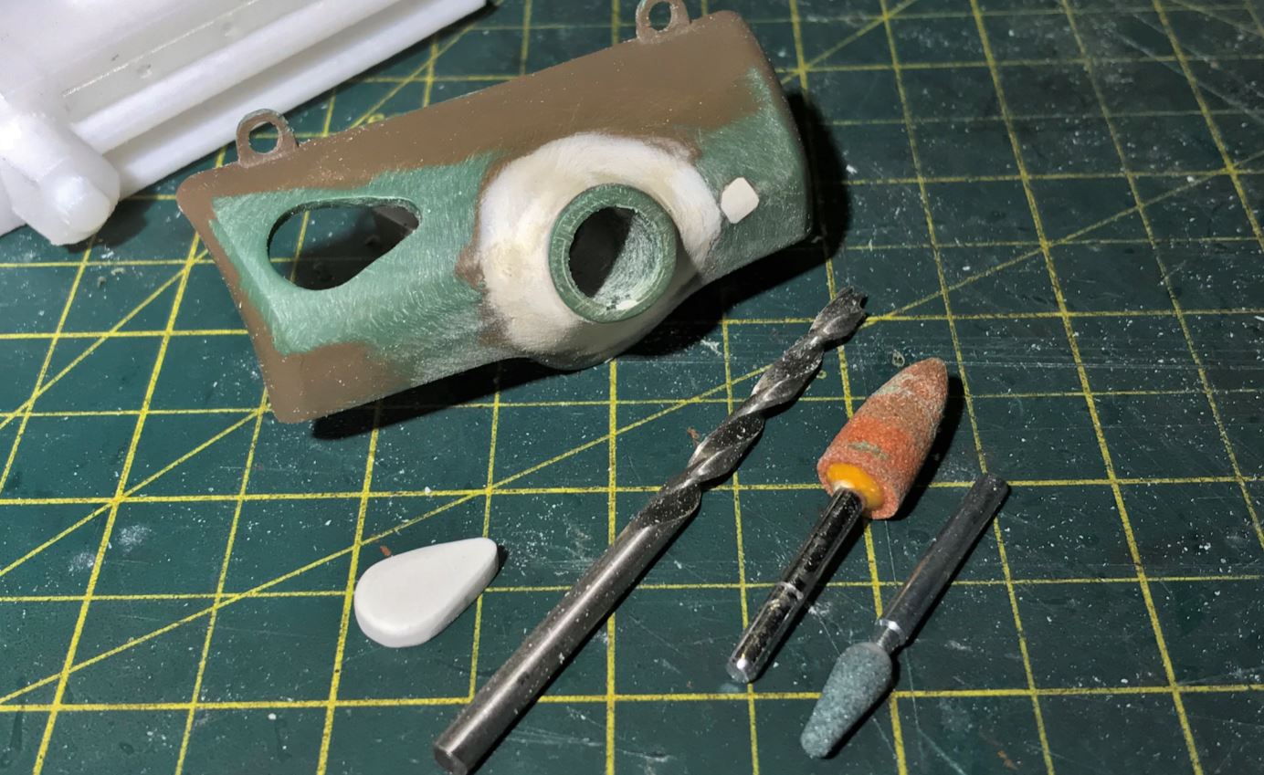 A new trap hole for the gun sight is made. It is dangerous to use a large drill bit that usually goes out of control on such scale. A small hole is made with a small bit and then a Dremel file (big and small) is used to enlarge the hole at both extremities. It does melt the plastic with a clean cut in a safe operation. Practice on a piece of junk plastic before doing this. Then a simple strait line is made between the two holes using a knife. A new trap is made of thick plasticard.