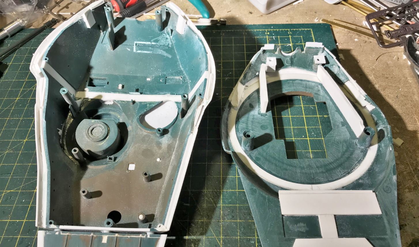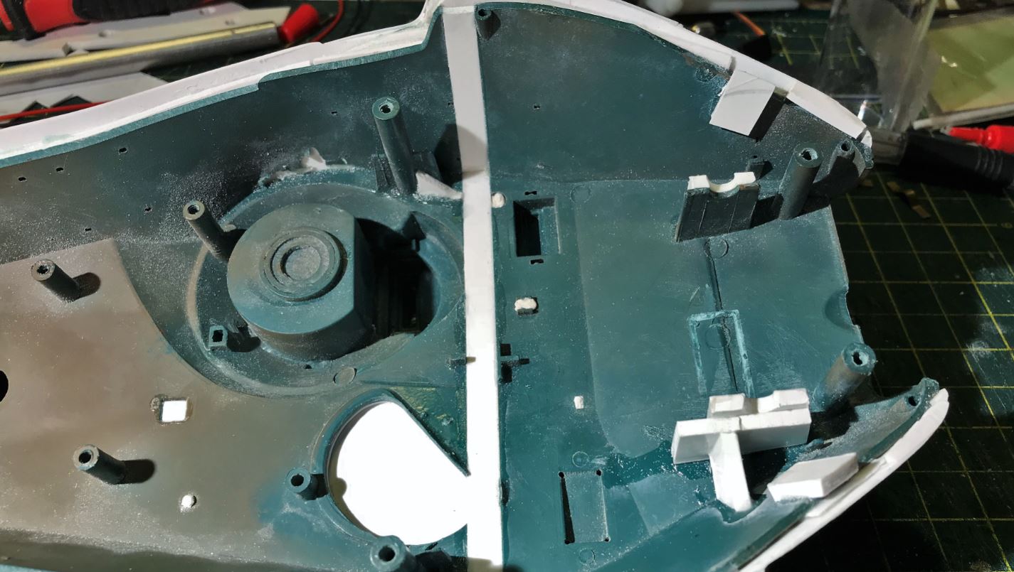 The section of the hole that will remain after enlargement of the hatch is plugged with plasticard, and later sanded smooth with putty.