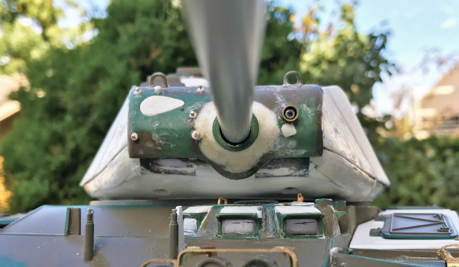 I am using a standard and inexpensive Clark recoil unit. The mantlet is installed using the Heng Long braces but it is positioned about 1mm more up front than the pre-drilled holes on the recoil unit, providing better higher and lower elevation. Lots of testing and fine tuning was required with the mantlet so that it optimally goes up and down.